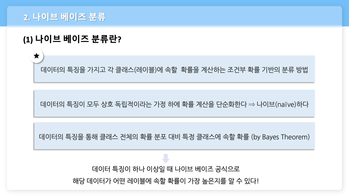 - Bayes Theorem에 의해 데이터의 특징을 통해 클래스 전체의 확률 분포 대비 특정 클래스에 속할 확률을 구하는 것이다.