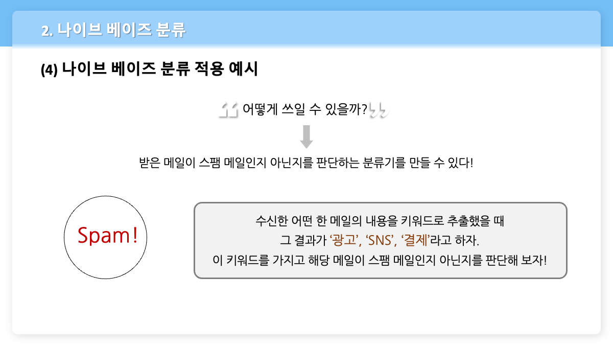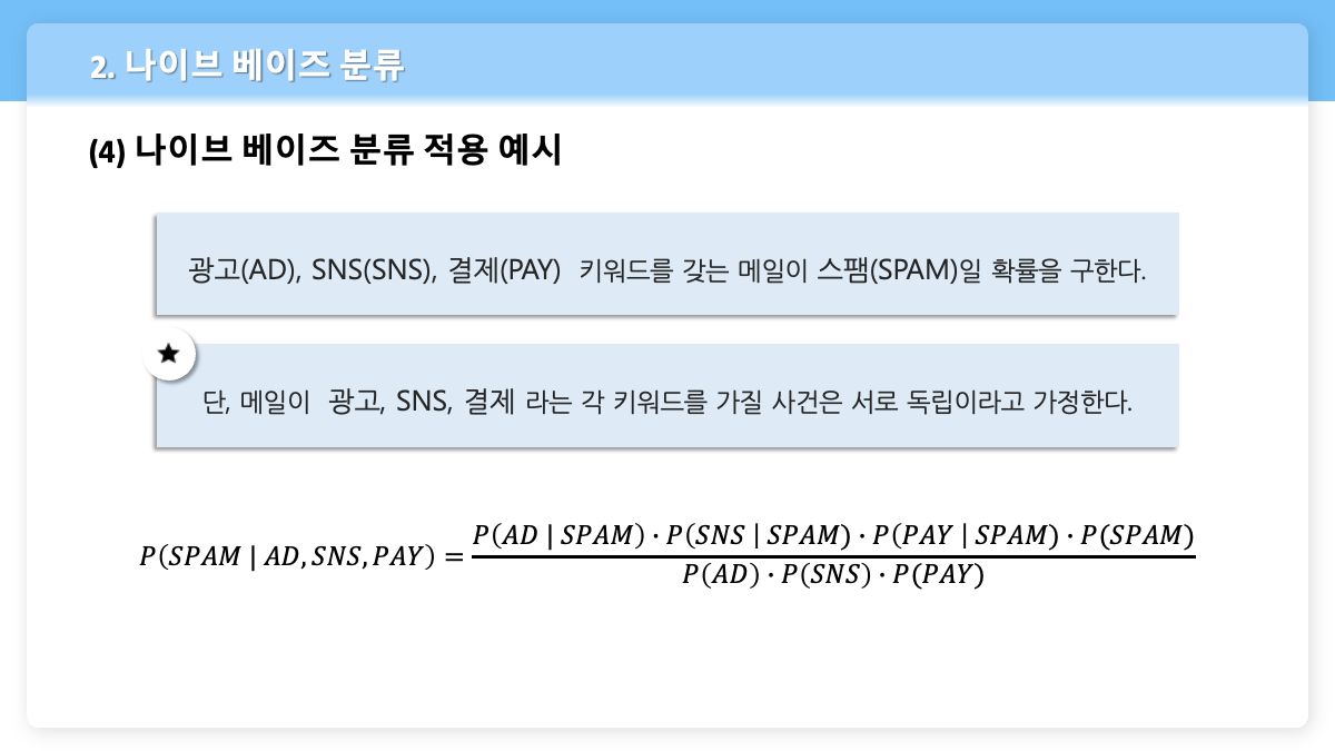 어떤 한 메일의 내용을 키워드로 추출했을 때, 그 결과가 '광고', 'SNS', '결제'라고 하자. 이 키워드를 가지고 해당 메일이 스팸 메일인지 아닌지를 판단하는 분류기를 만들 때 나이브 베이즈 분류를 사용할 수 있다.
