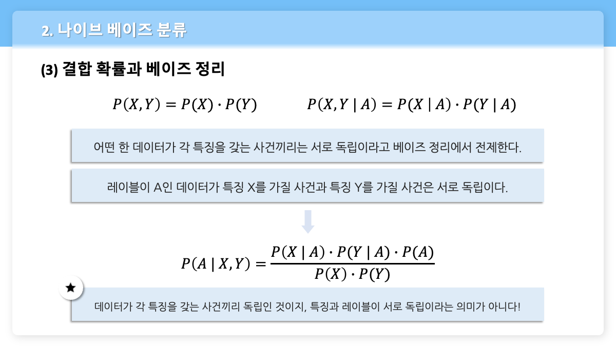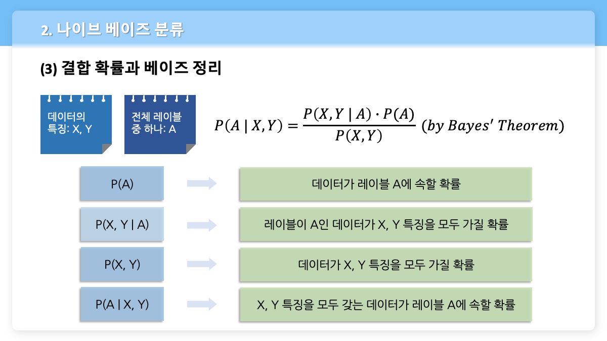 - $P(X, Y | A)$ ⇒ 레이블이 A인 데이터가 X, Y 특징을 모두 가질 확률