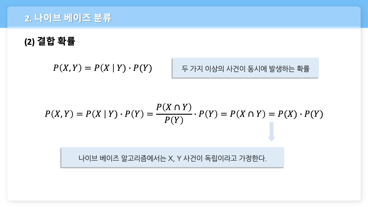 - 나이브 베이즈 알고리즘에서는 X, Y 사건이 독립이라고 가정하므로 다음과 같은 식이 성립할 수 있다.