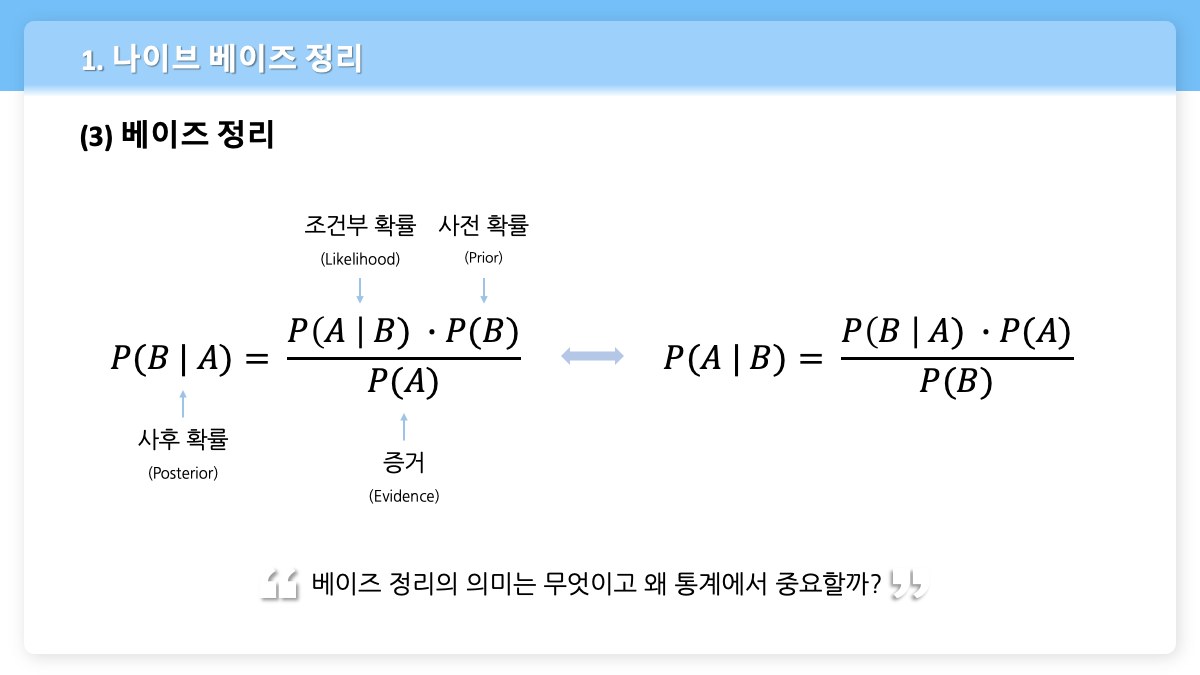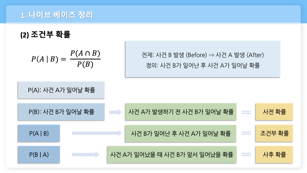 - $P(B|A)$: 사건 A가 일어났을 때 사건 B가 앞서 일어났을 확률 = 사후확률 (사후확률도 조건부 확률에 속함)
