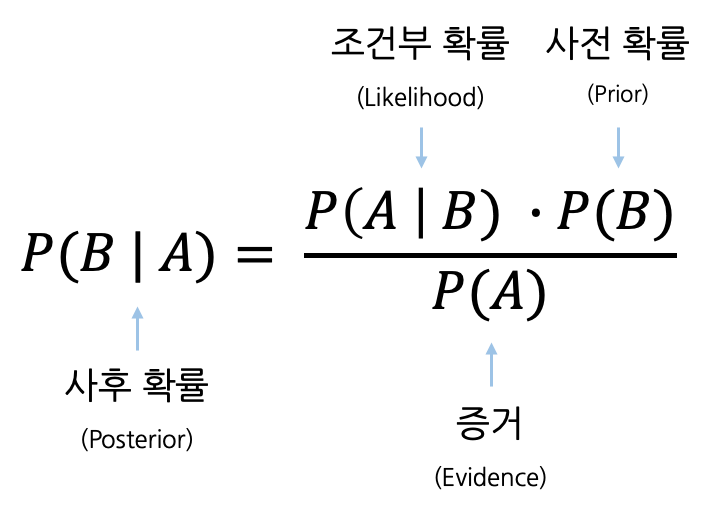 - $P(B)$: 사건 B가 일어날 확률 = 사건 A가 발생하기 전 사건 B가 일어날 확률 = 사전확률
