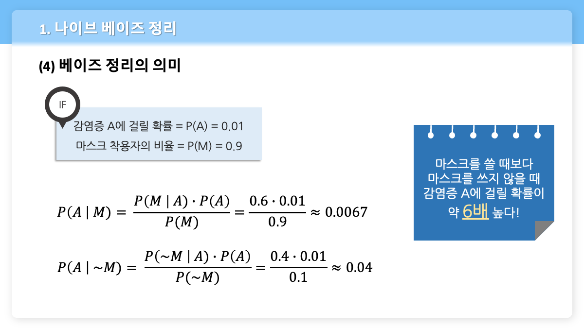 - $P(A|M)$ ⇒ 마스크를 착용한 사람 중 감염증 A에 걸린 사람의 비율