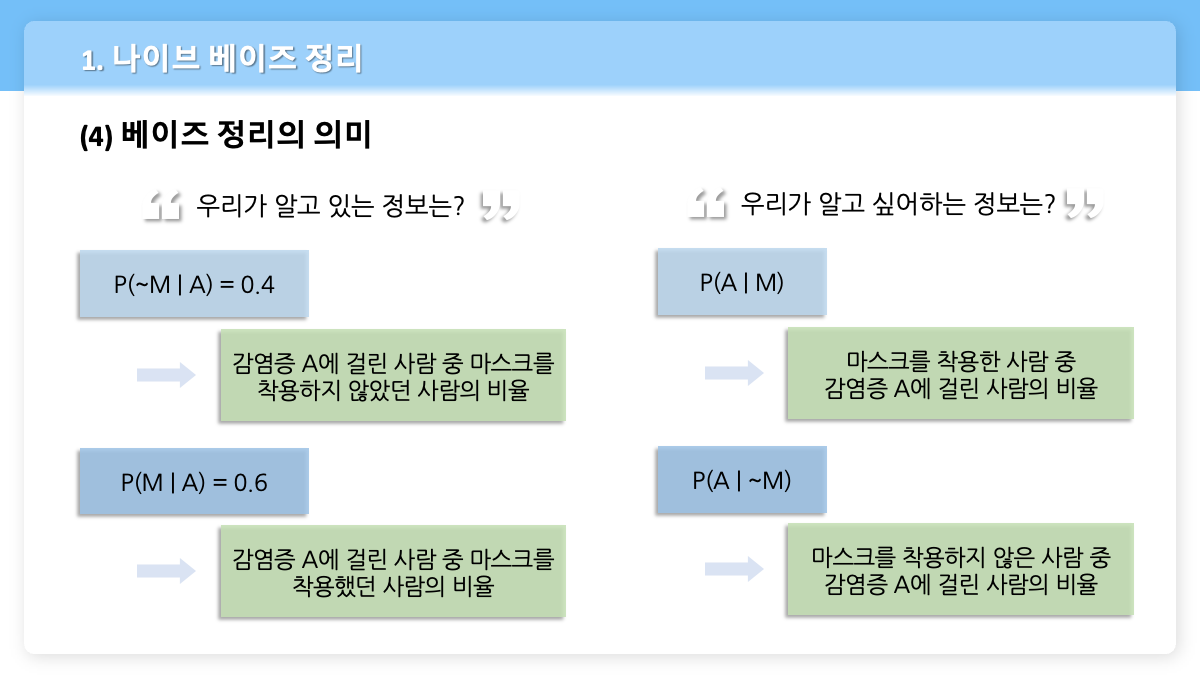 - $P(A|M)$ ⇒ 마스크를 착용한 사람 중 감염증 A에 걸린 사람의 비율