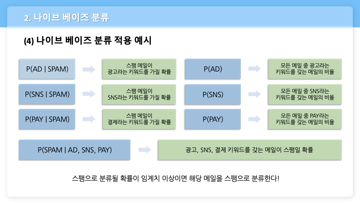 어떤 한 메일의 내용을 키워드로 추출했을 때, 그 결과가 '광고', 'SNS', '결제'라고 하자. 이 키워드를 가지고 해당 메일이 스팸 메일인지 아닌지를 판단하는 분류기를 만들 때 나이브 베이즈 분류를 사용할 수 있다.