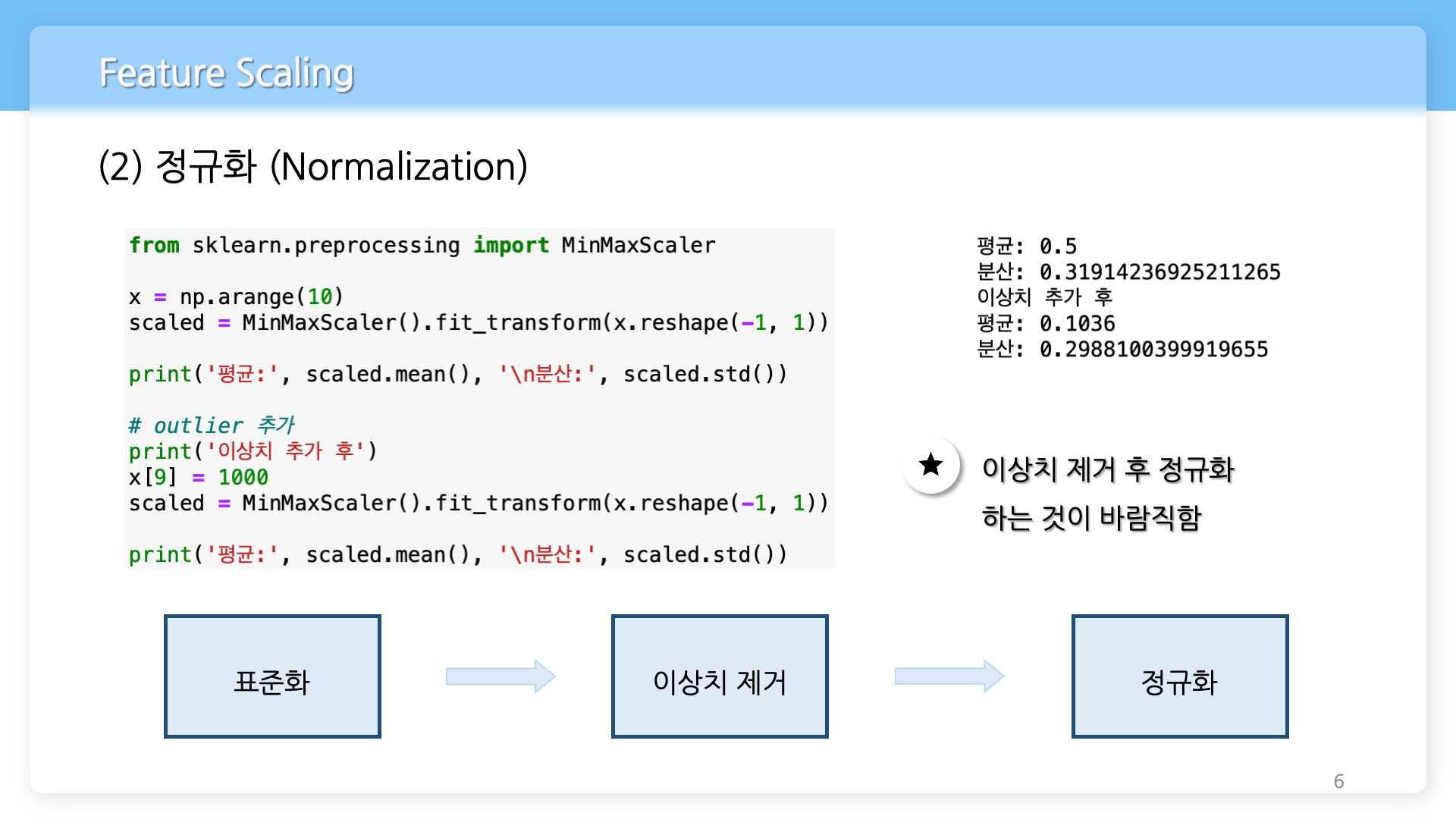 - 데이터에서 이상치를 추가하기 전과 후 데이터를 정규화했을 때의 결과는 큰 차이를 보인다. 그래서 일반적으로 이상치를 제거한 후 정규화를 하는 것이 바람직하다. 위의 표준화에서의 내용과 종합하면 데이터를 표준화하고 그 결과에서 이상치를 제거한 후 정규화를 진행하는 것이 바람직하다.