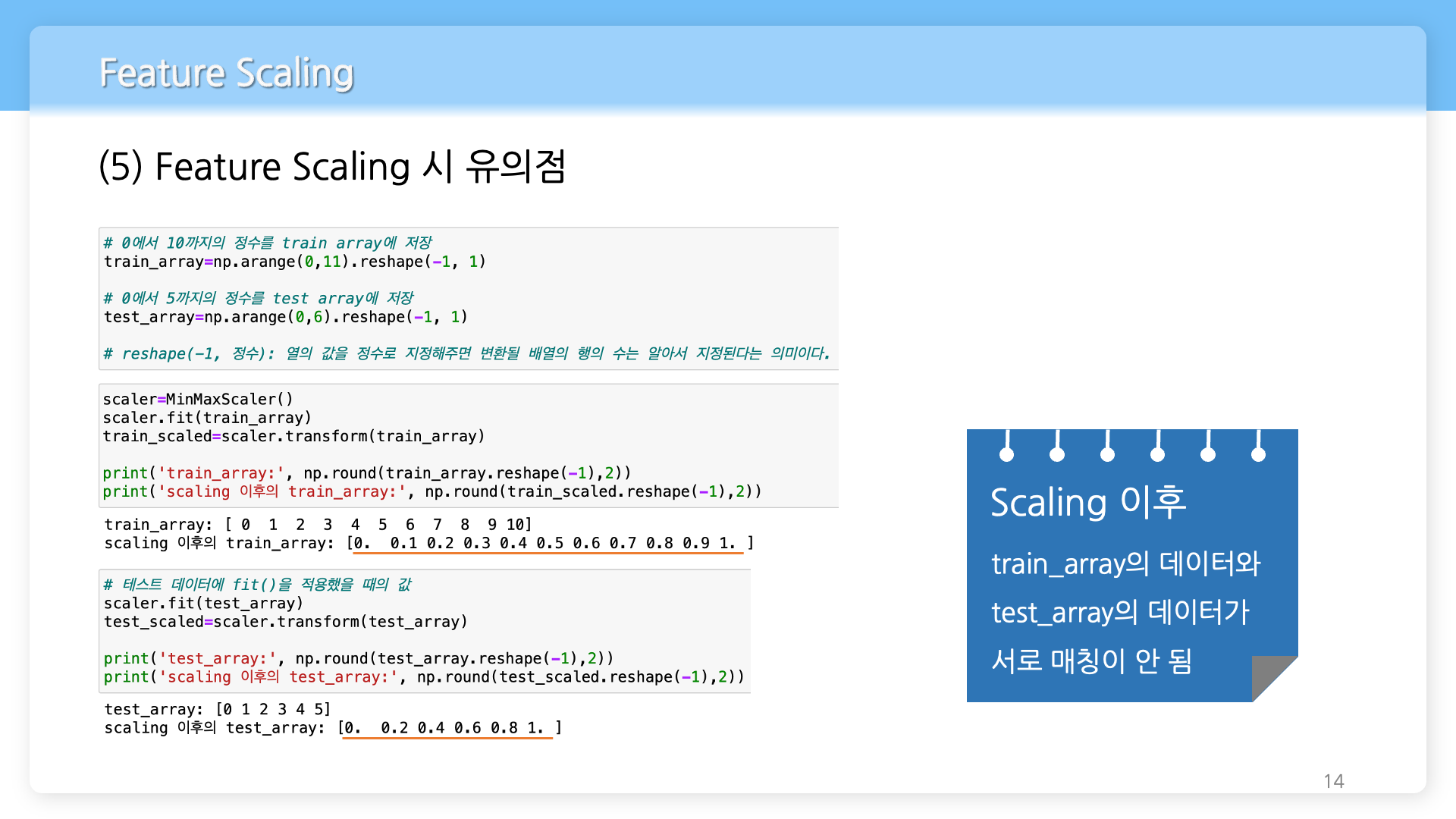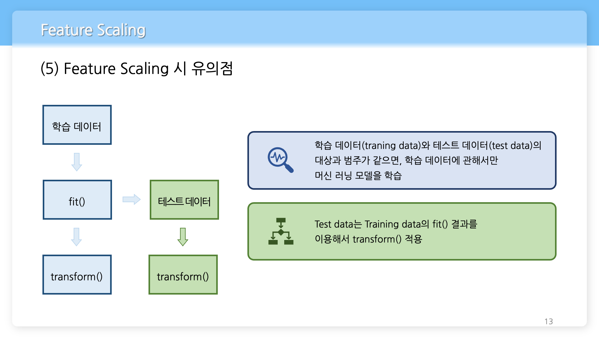 - 정리하면, 머신러닝 모델은 학습 데이터를 기반으로 학습이 되므로 반드시 테스트 데이터는 학습 데이터의 스케일링 기준을 따라야 한다. 따라서 테스트 데이터에는 다시 fit()을 적용해서는 안 된다.