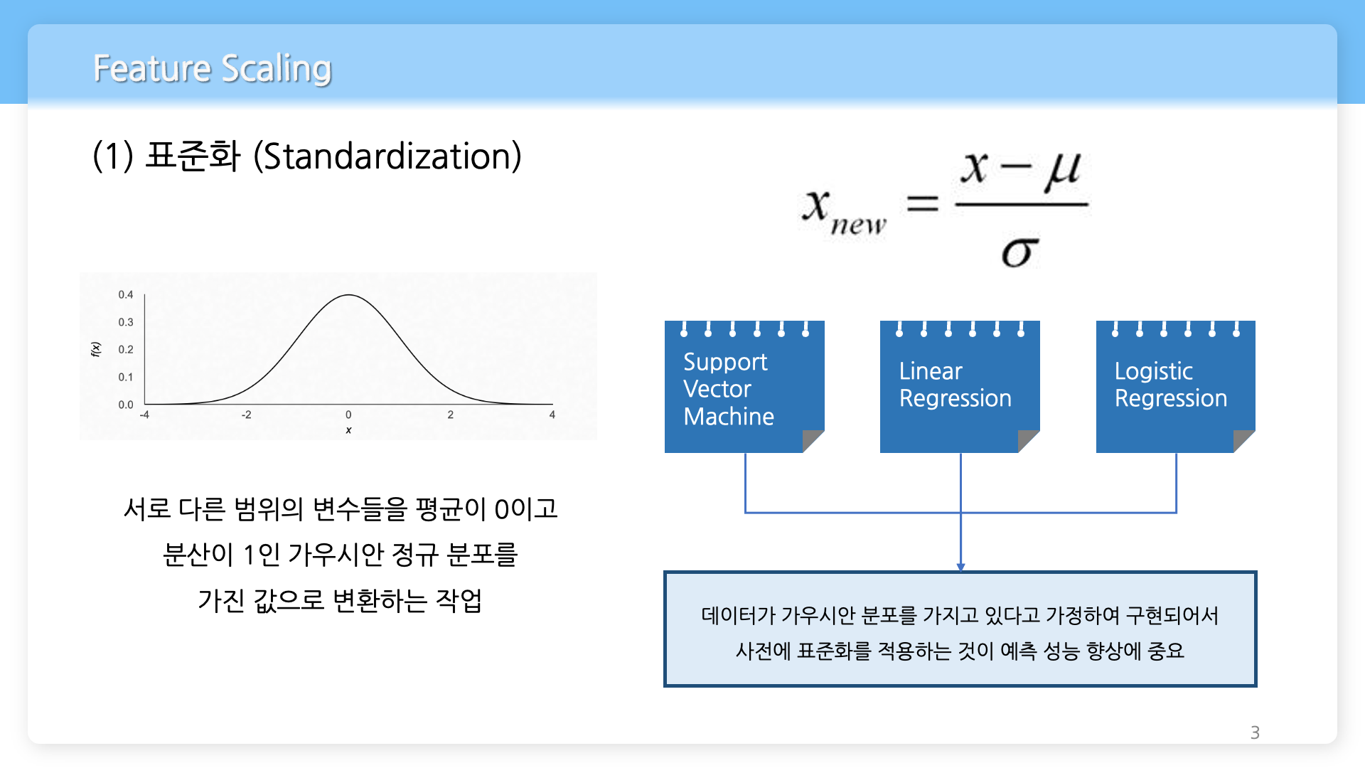 - 머신러닝에서 사용하는 Support Vector Machine, Linear Regression, Logistic Regression 모델은 데이터가 가우시안 분포를 가지고 있다고 가정하여 구현되어 있어서 사전에 학습 데이터에 관해 표준화를 적용하는 것이 모델의 예측 성능 향상에 중요하다.