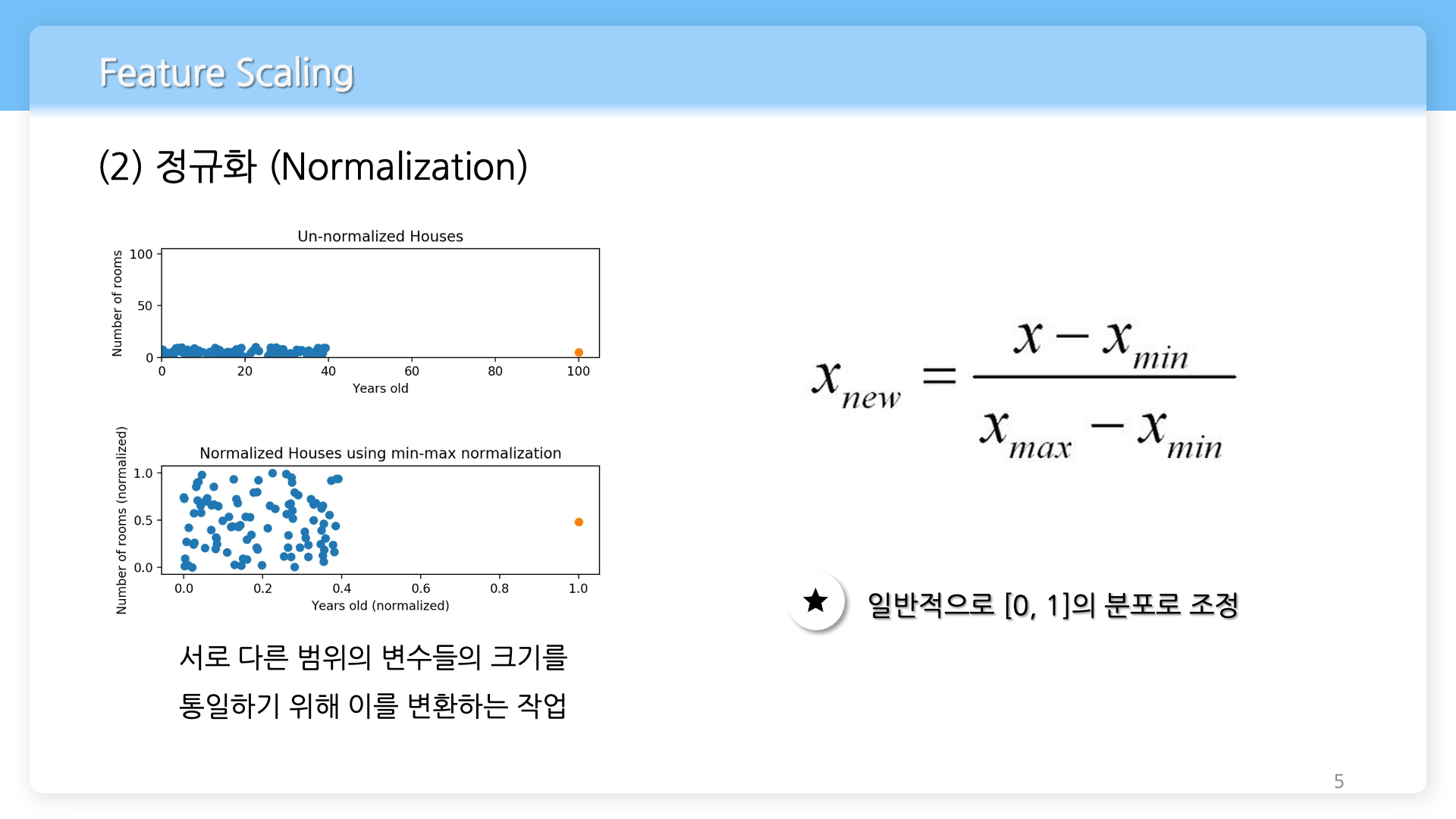 - 서로 다른 범위의 변수들의 크기를 통일하기 위해 이를 변환하는 작업이다. 일반적으로 [0, 1] 범위의 분포로 조정한다.