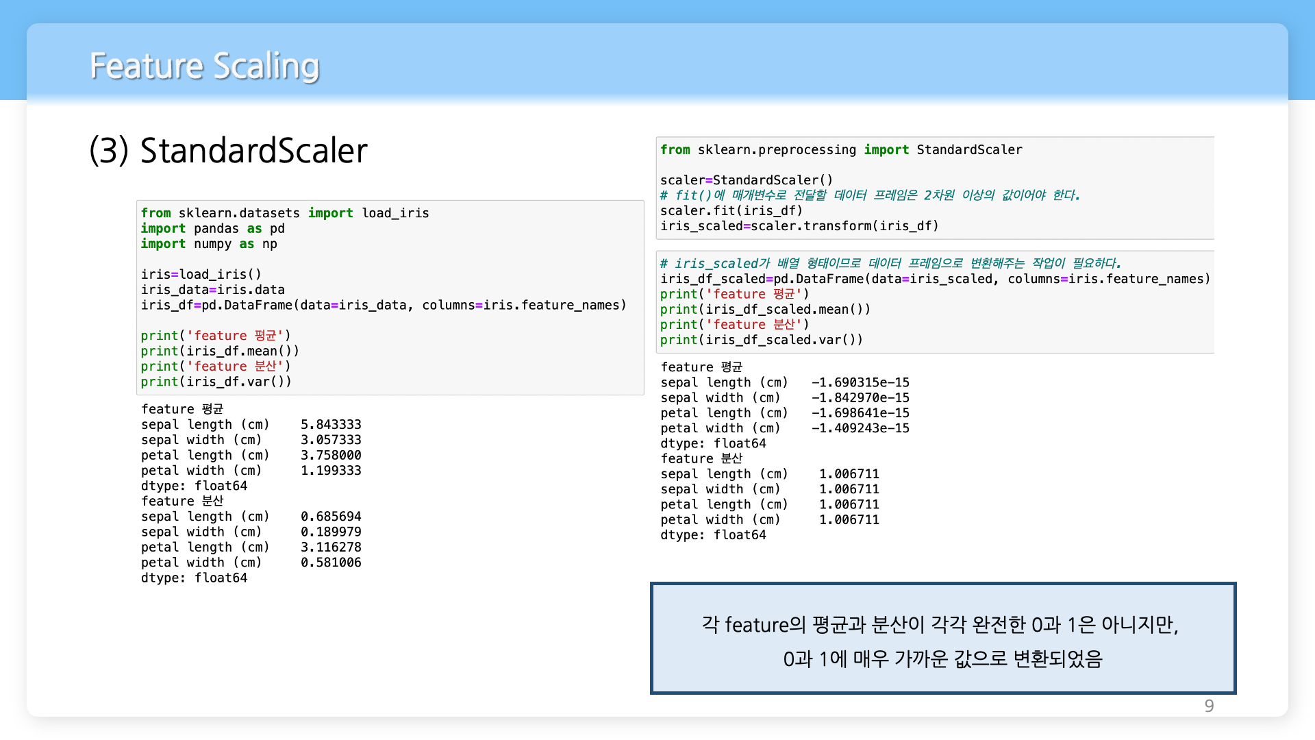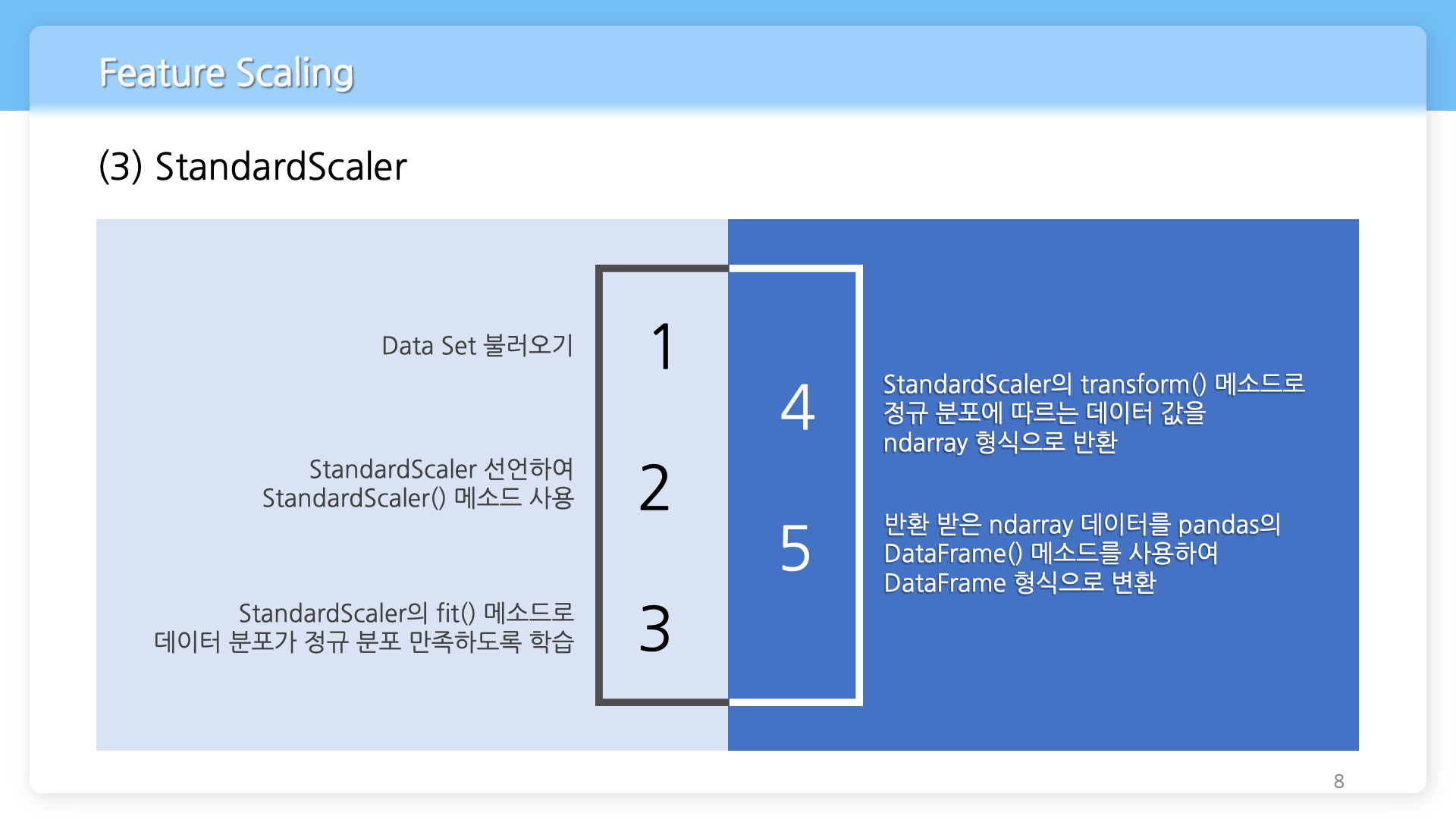 - StandardScaler를 선언하여 StandardScaler() 메소드를 사용한다.