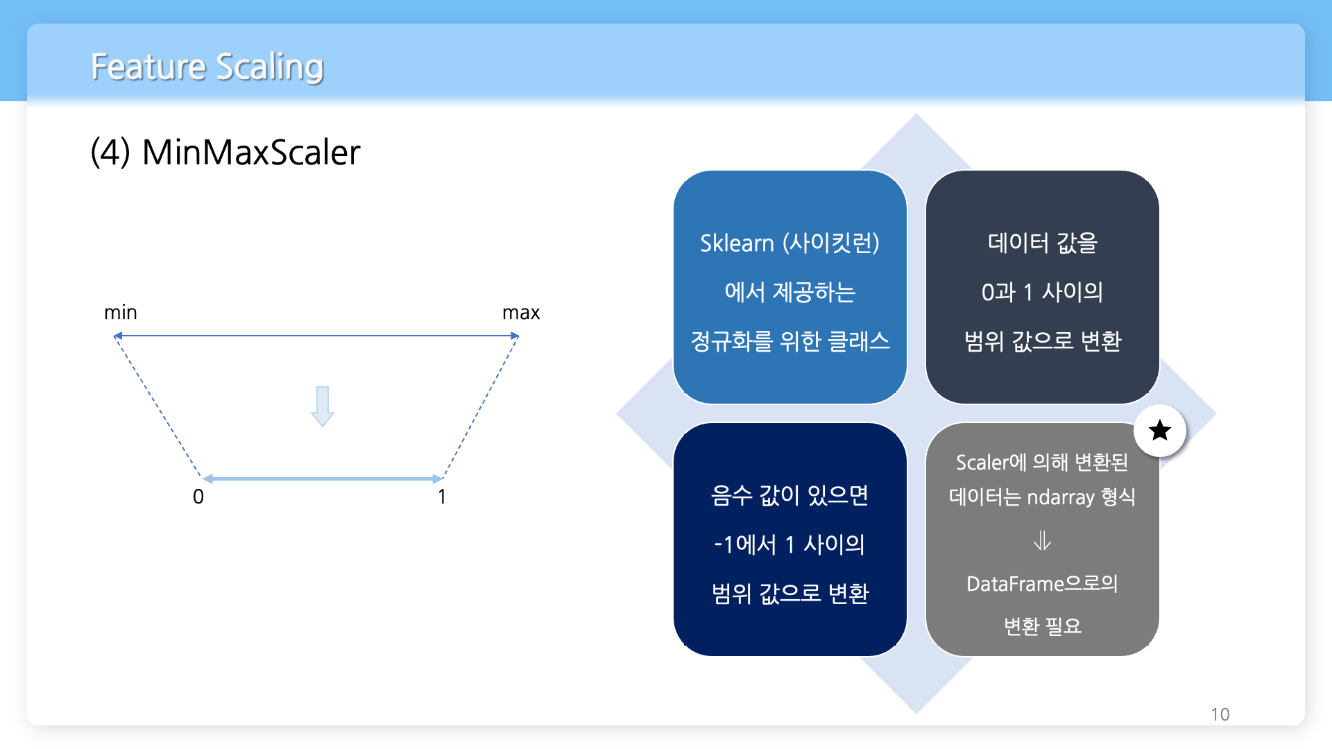 - Scaler에 의해 변환된 데이터는 ndarray 형식이므로 데이터 관리의 용이성을 위해 DataFrame 형식으로의 명시적 변환이 필요할 수 있다.