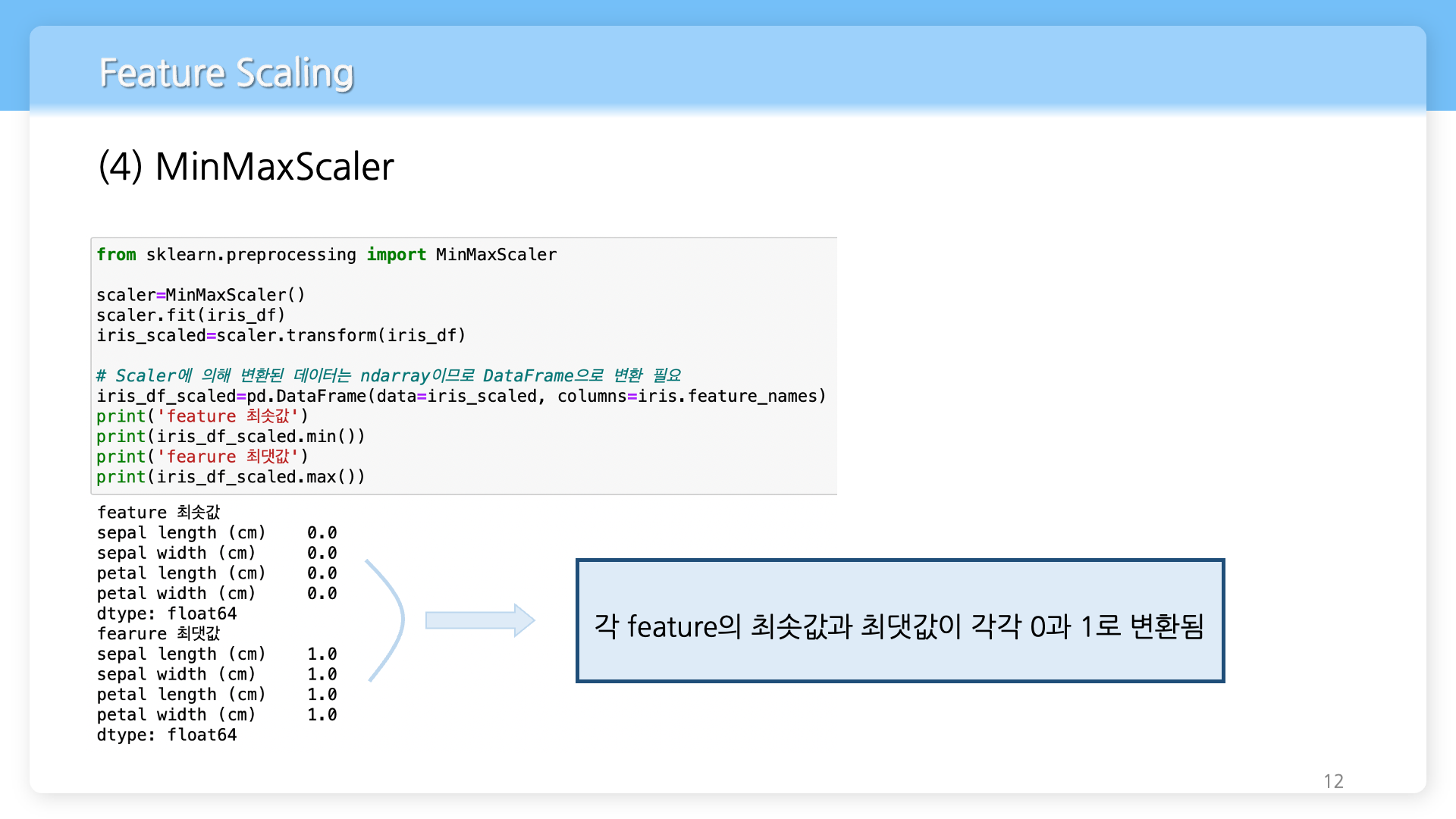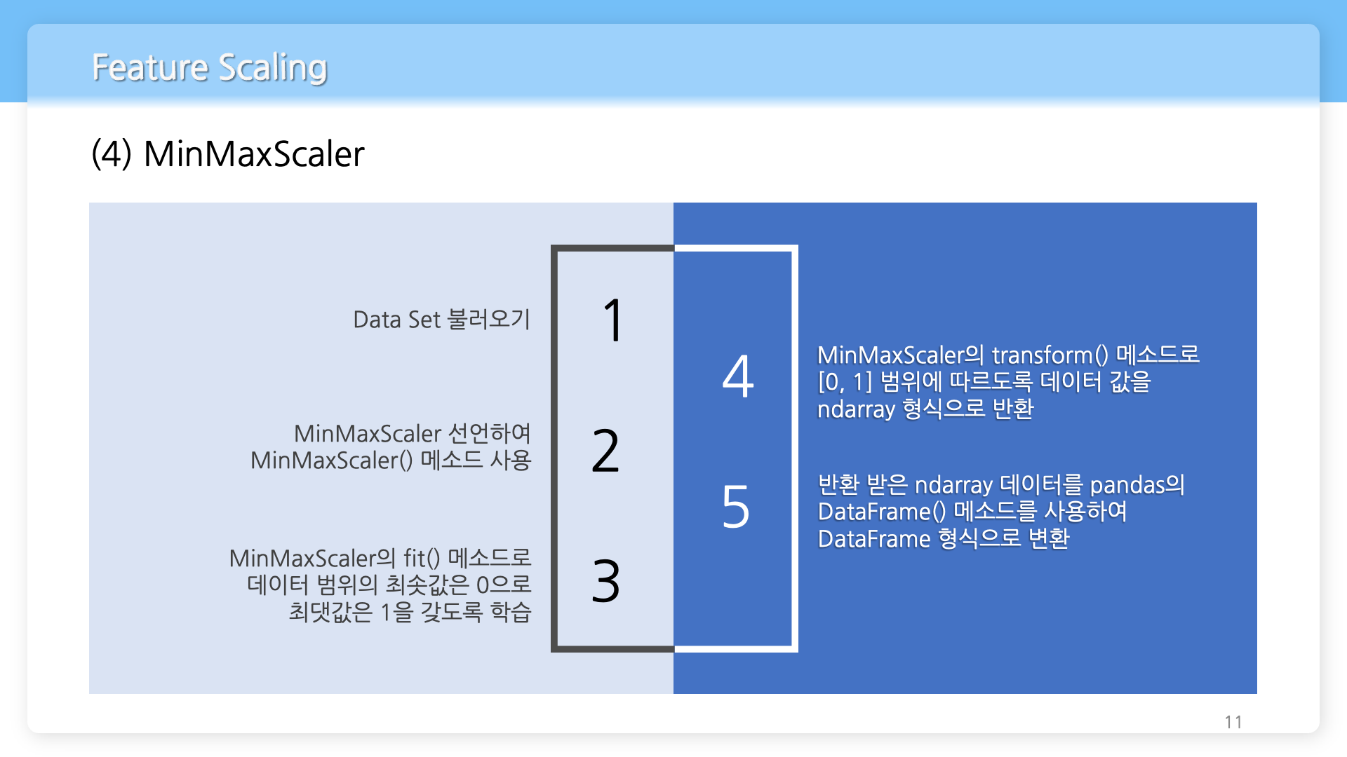 - MinMaxScaler의 fit() 메소드로 데이터 범위가 [0, 1]이 되도록 최솟값은 0, 최댓값은 1을 갖도록 모델을 학습시킨다.