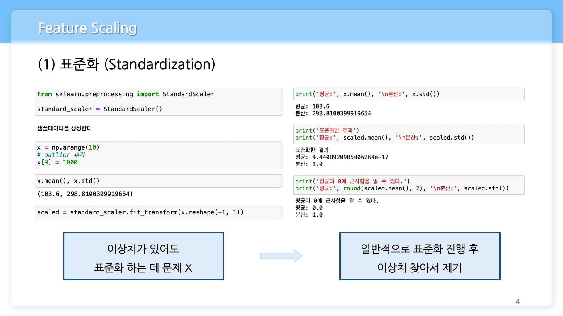 - 일반적으로 데이터에 값이 너무 크거나 작은 이상치가 있어도 이를 표준화 하는 데는 문제 없다. 그래서 표준화를 진행한 후 이상치를 찾아서 제거하는 게 바람직하다.
