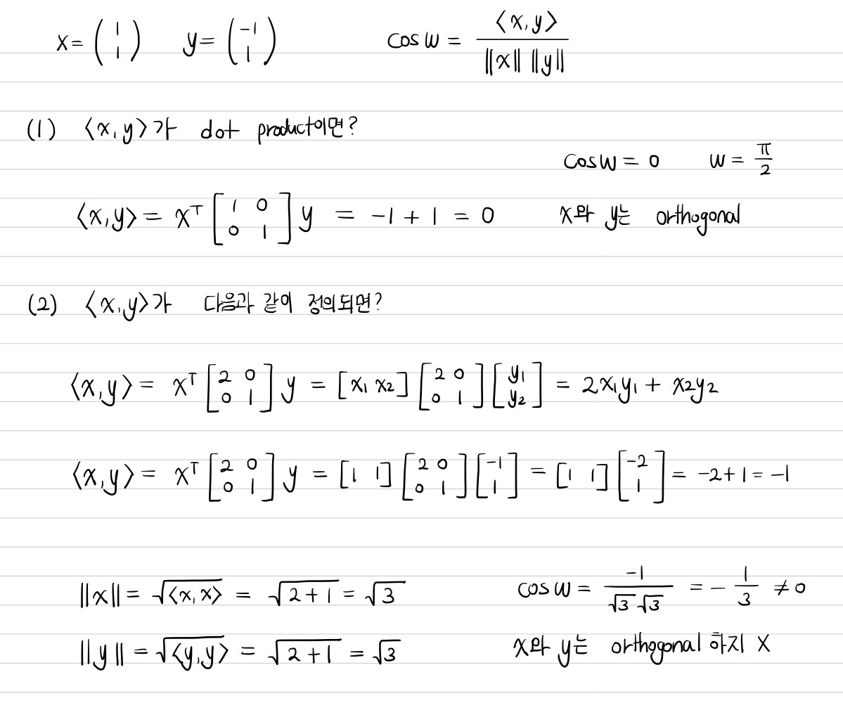 여기서 주목해야 할 사실은 orthogonality가 inner product에 의해 결정된다는 사실이다. 그러므로 만약에 dot product처럼 어떤 한 inner product에서는 orthogonal한 두 벡터가 다른 inner product를 통해 각도를 정의하면 두 벡터가 orthogonal하지 않을 수 있다.