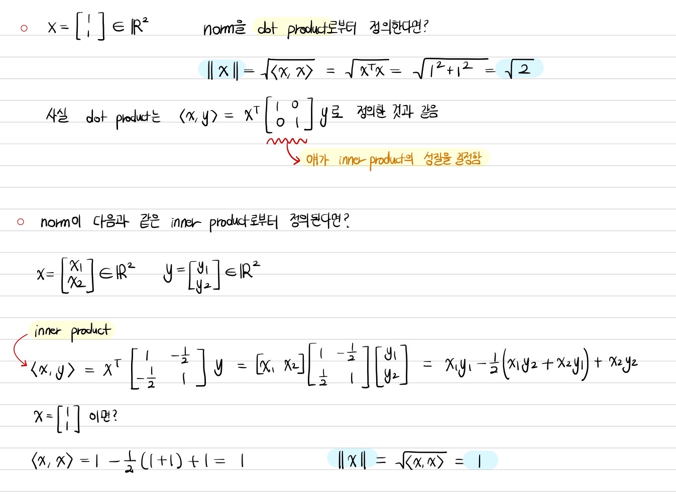 다음은 서로 다른 inner product에 의해 유도된 norm이 어떻게 달라질 수 있는지를 확인하는 예제이다.