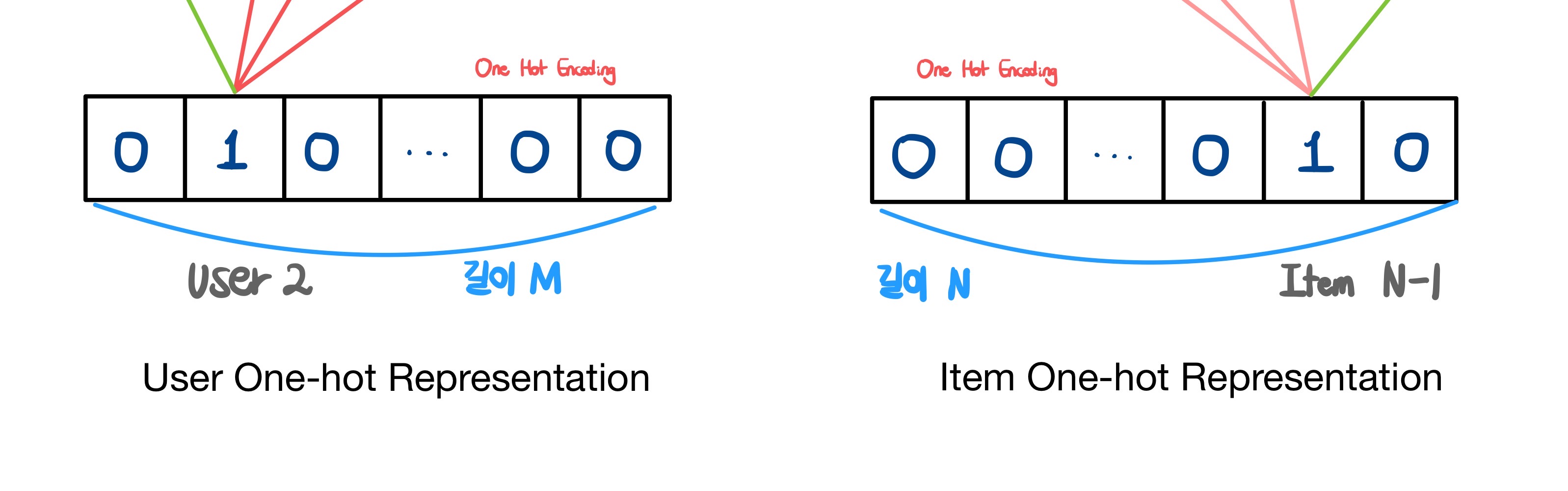 이때, 사용자와 아이템의 각 행렬은 one-hot encoding 형태의 벡터로 구성된다.