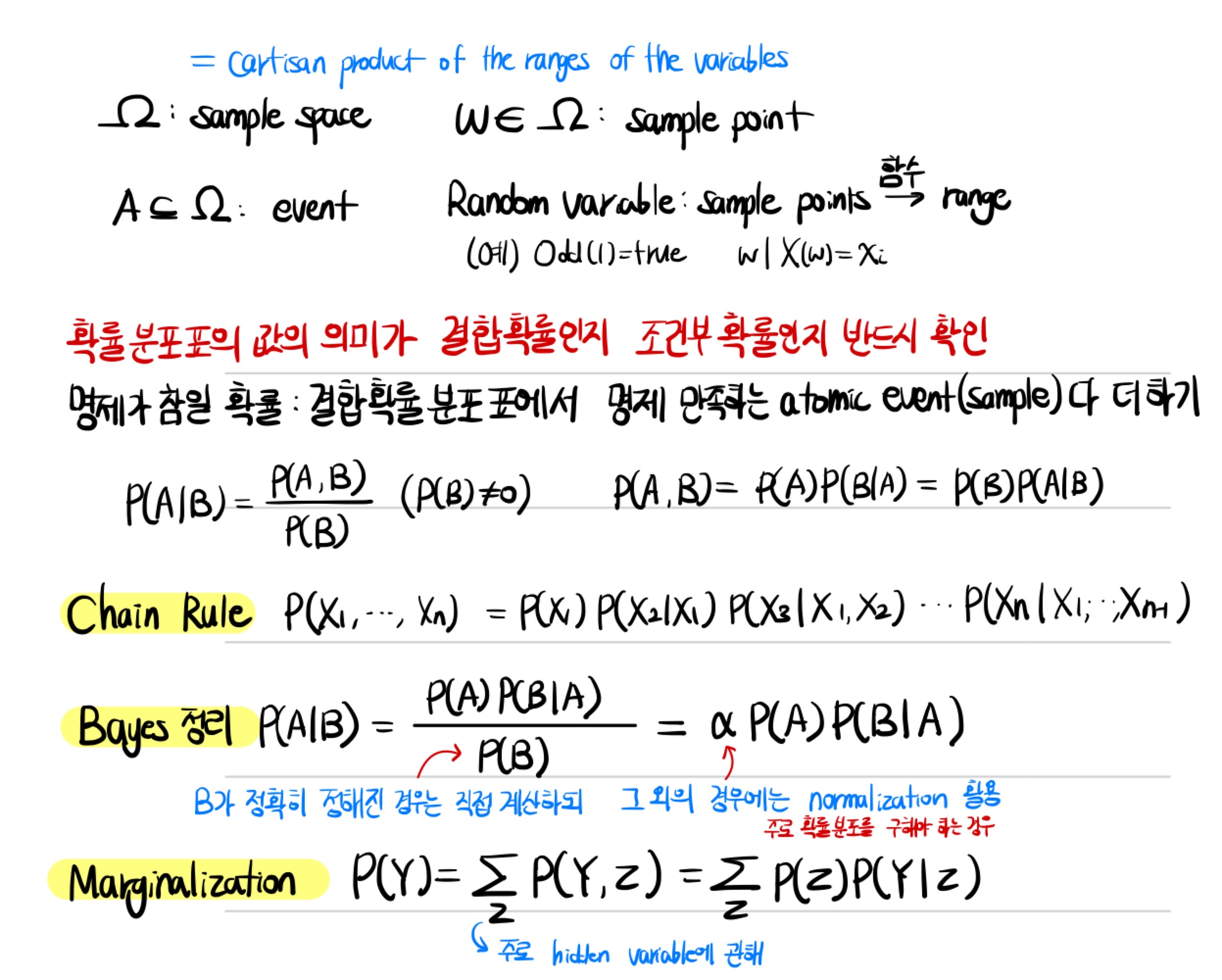 또한 chain rule은 이후 시리즈 내용에서 등장할 HMM(Hidden Markov Models)에서 특정 시점의 확률을 추론할 때 사용되는 핵심적인 정리이므로 꼭 익혀두는 것을 권장한다.