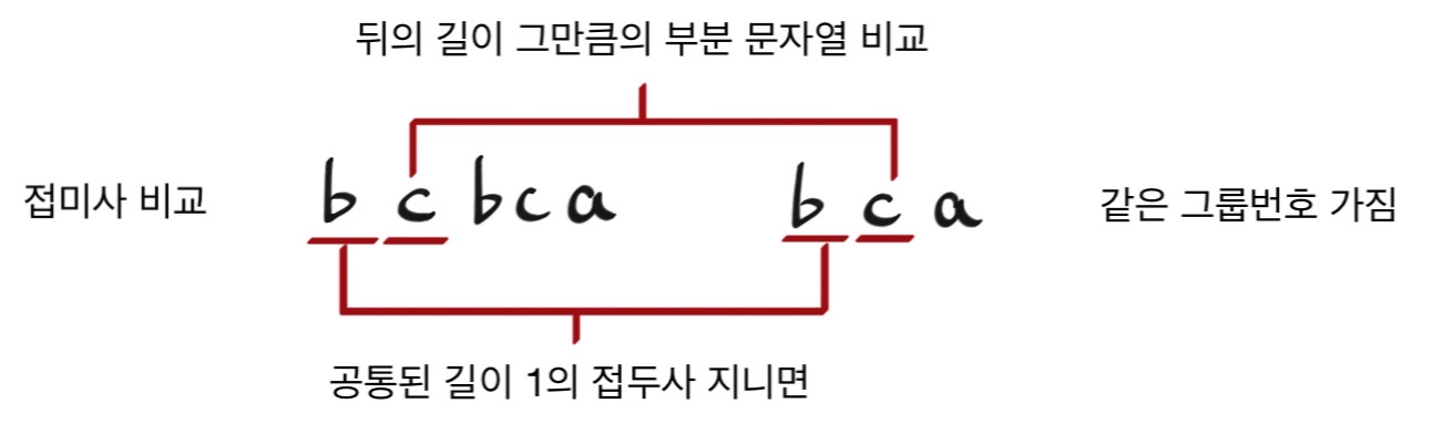 a와 abcbca의 비교에서 a 뒤의 문자열은 비어 있는데, 빈 문자열에 관한 우선순위는 가장 높으므로 a의 그룹 번호가 더 작게 된다.