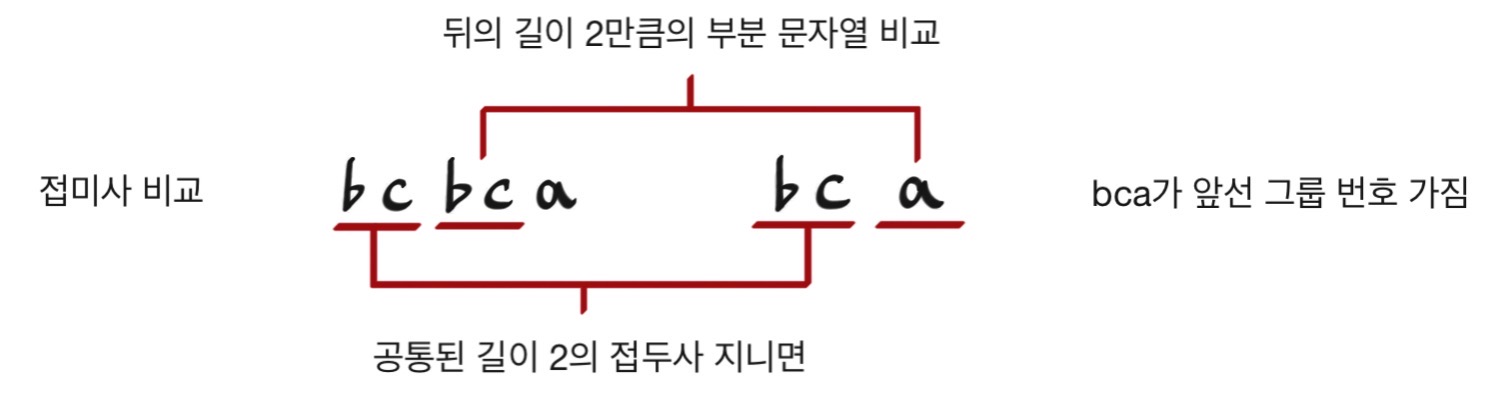 이전 그룹 번호로 정렬된 상태에서 인접한 두 접미사의 길이 2만큼의 접두사끼리 비교해서 새로 정렬한 후 그룹 번호를 부여한다.