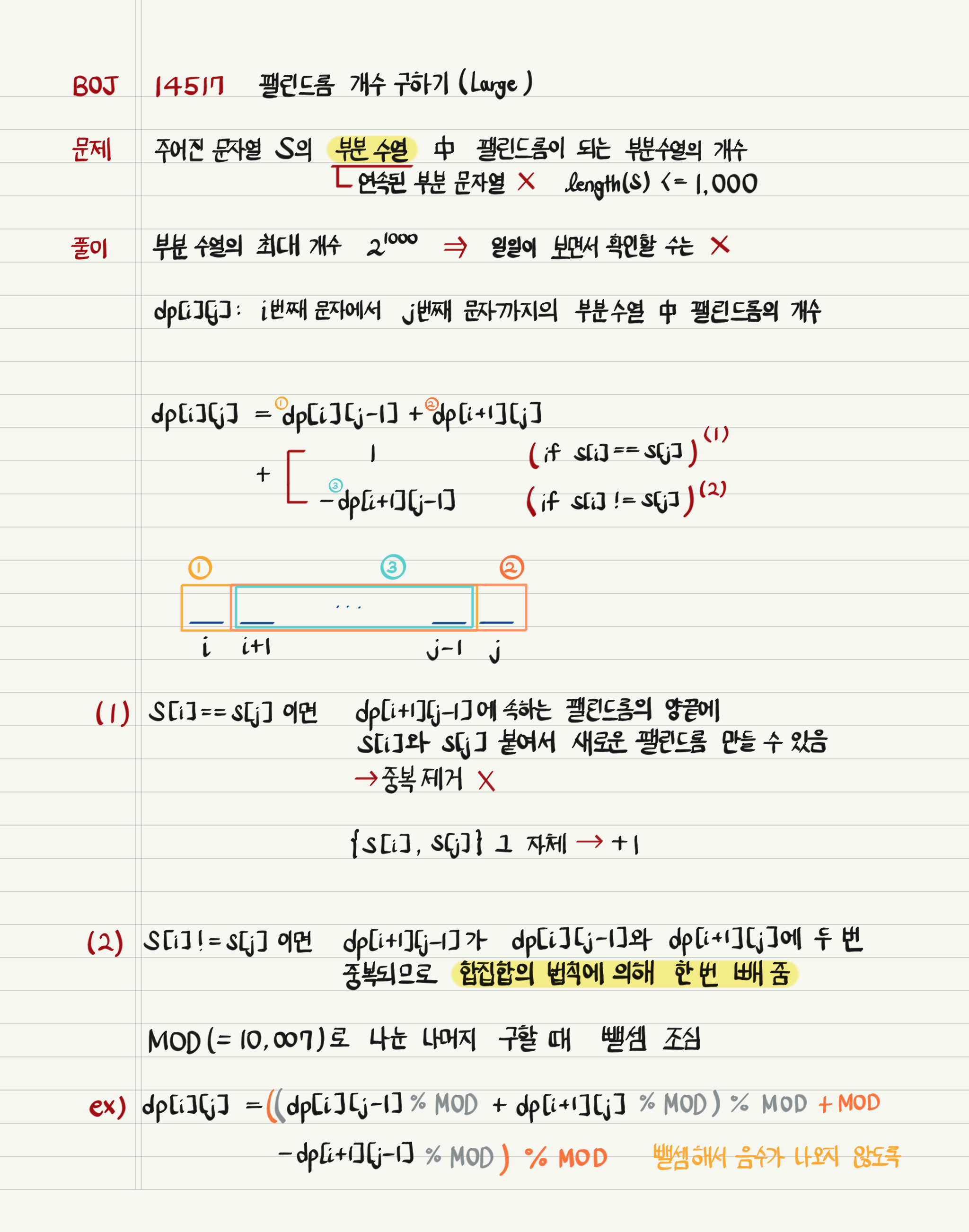 여기까지는 문자열 S의 길이 제한만 다를 뿐 ‘BOJ 백준 14505번 팰린드롬 개수 구하기 (Small)’와 동일한 문제이다. 그런데 이 문제에서는 구한 값을 10,007로 나눈 나머지를 구해야 하므로 이에 대한 처리가 필요하다.