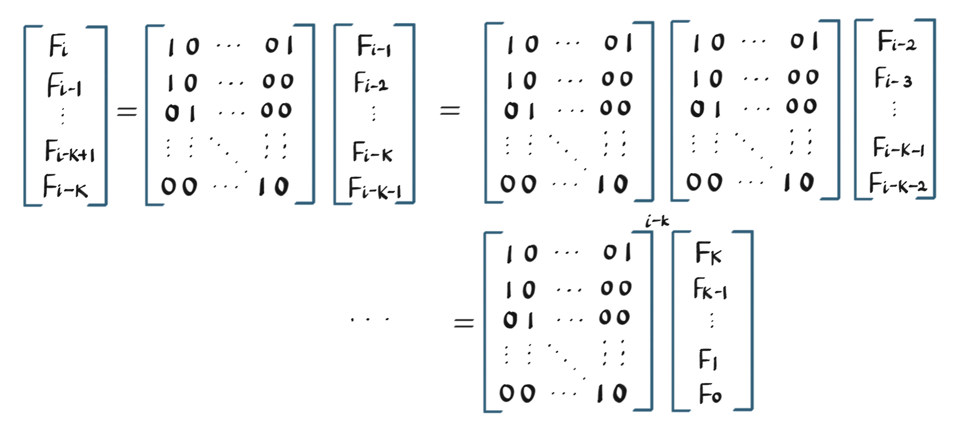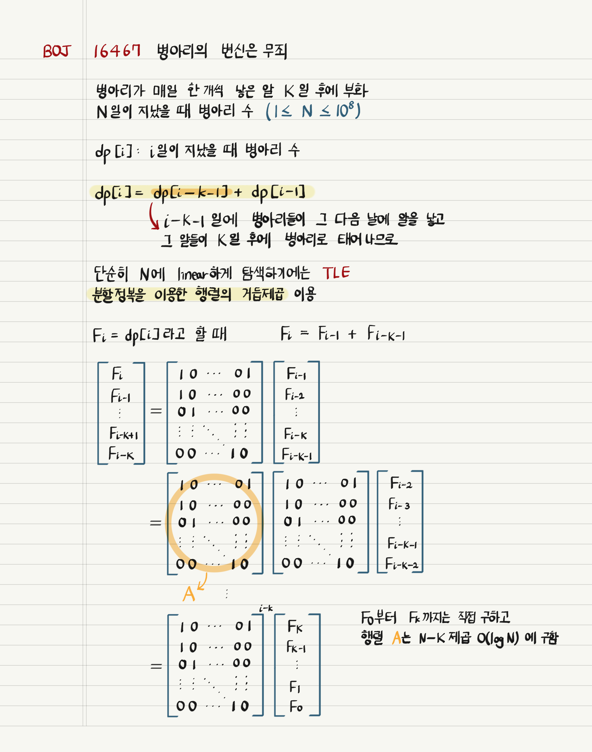 서술의 편의상 dp[i]를 F[i]로 치환하면, F[i] = F[i - 1] + F[i - K - 1]의 식이 나온다. 그리고 F[i - 1] = F[i - 1], F[i - 2]= F[i - 2], ...임을 이용하여 행과 열의 수가 K + 1인 정방행렬 A를 지닌 행렬의 곱셈 식으로 표현하면 다음과 같다.