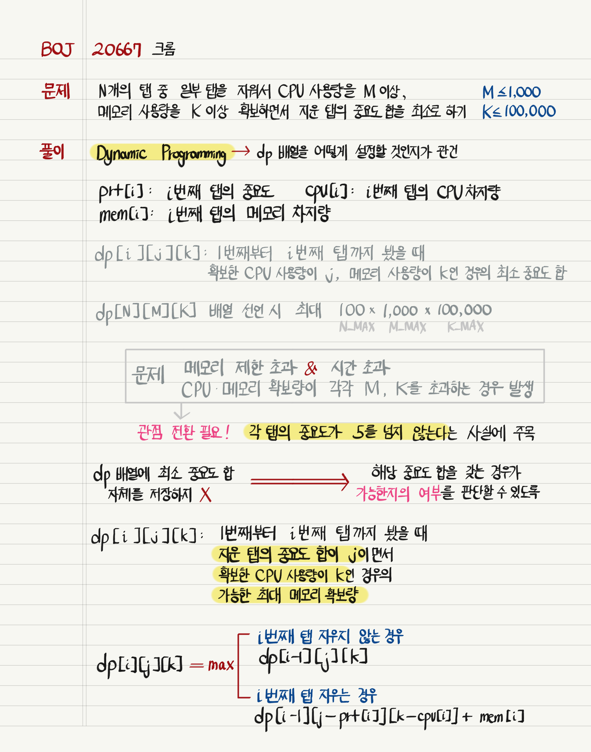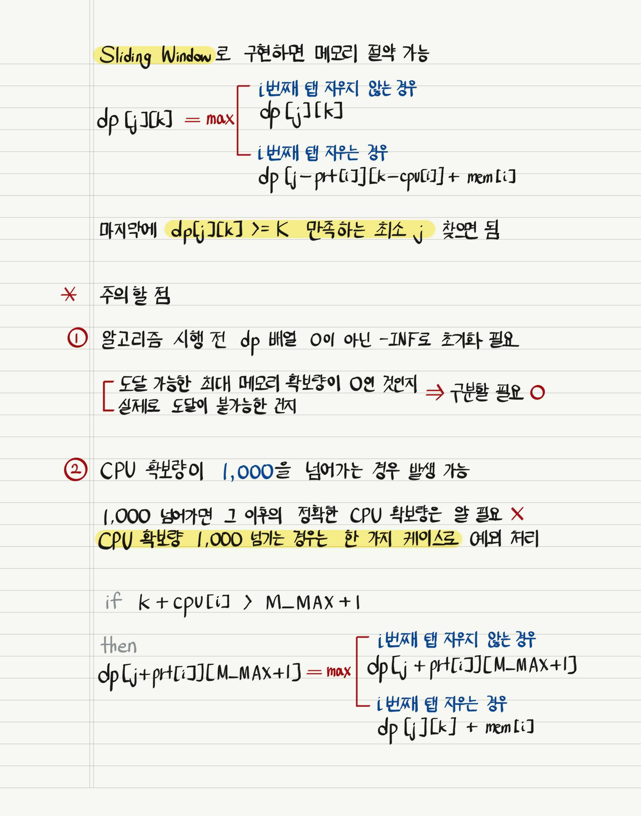 예를 들어, 3개의 지울 수 있는 탭이 있고 목표 CPU 확보량이 1000, 목표 메모리 확보량이 3인데, 각 탭의 CPU 사용량과 메모리 할당량이 각각 1000, 1이면 3개의 탭을 모두 지울 경우의 CPU 확보량인 3000을 dp 배열에 반영할 수 없다. 그렇다고 가능한 모든 범위의 CPU 확보량을 dp 배열에 반영할 필요는 없다. 문제의 최대 CPU 확보량 상한인 1,000을 넘어가면 그 이후의 정확한 CPU 확보량이 얼마인지는 알 필요가 없으므로 이에 대한 경우를 한 가지 케이스로 예외 처리를 하면 된다.