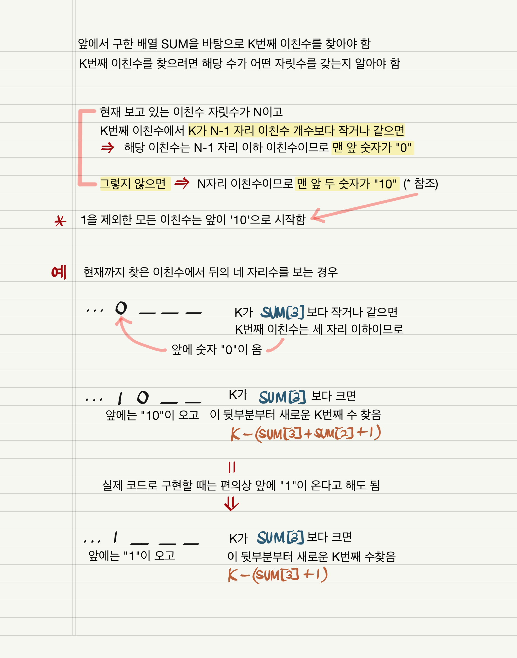 그러면 K번째 이친수가 어떠한 자리 수를 지니는지 SUM 배열 값을 통해 알 수 있고, 가장 앞 자리 숫자를 제외한 나머지 자리의 이친수 개수를 참고하여 앞 자리부터 가능한 숫자를 차례로 채워나간다.
