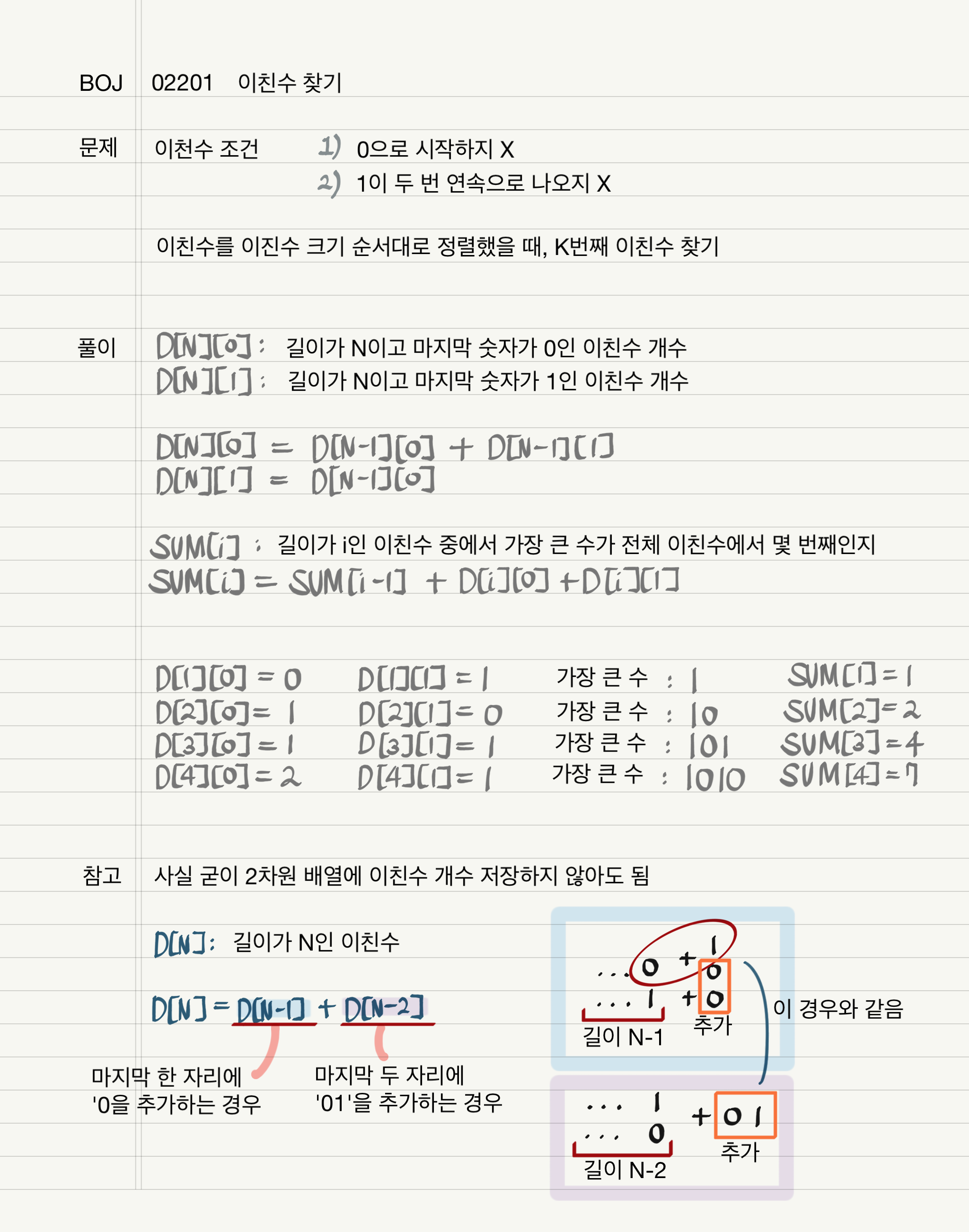 단순히 각 자리 수마다의 이친수 개수만 구했다고 해서 K번째의 이친수를 찾을 수는 없다. K라는 서수는 앞에서 누적되어 온 수여서다. 따라서 가장 작은 이친수부터 N 자리 이친수 중 가장 큰 수까지 몇 개의 이친수가 있는지 아는 것이 문제의 목표를 찾는 데 있어서 key가 된다.