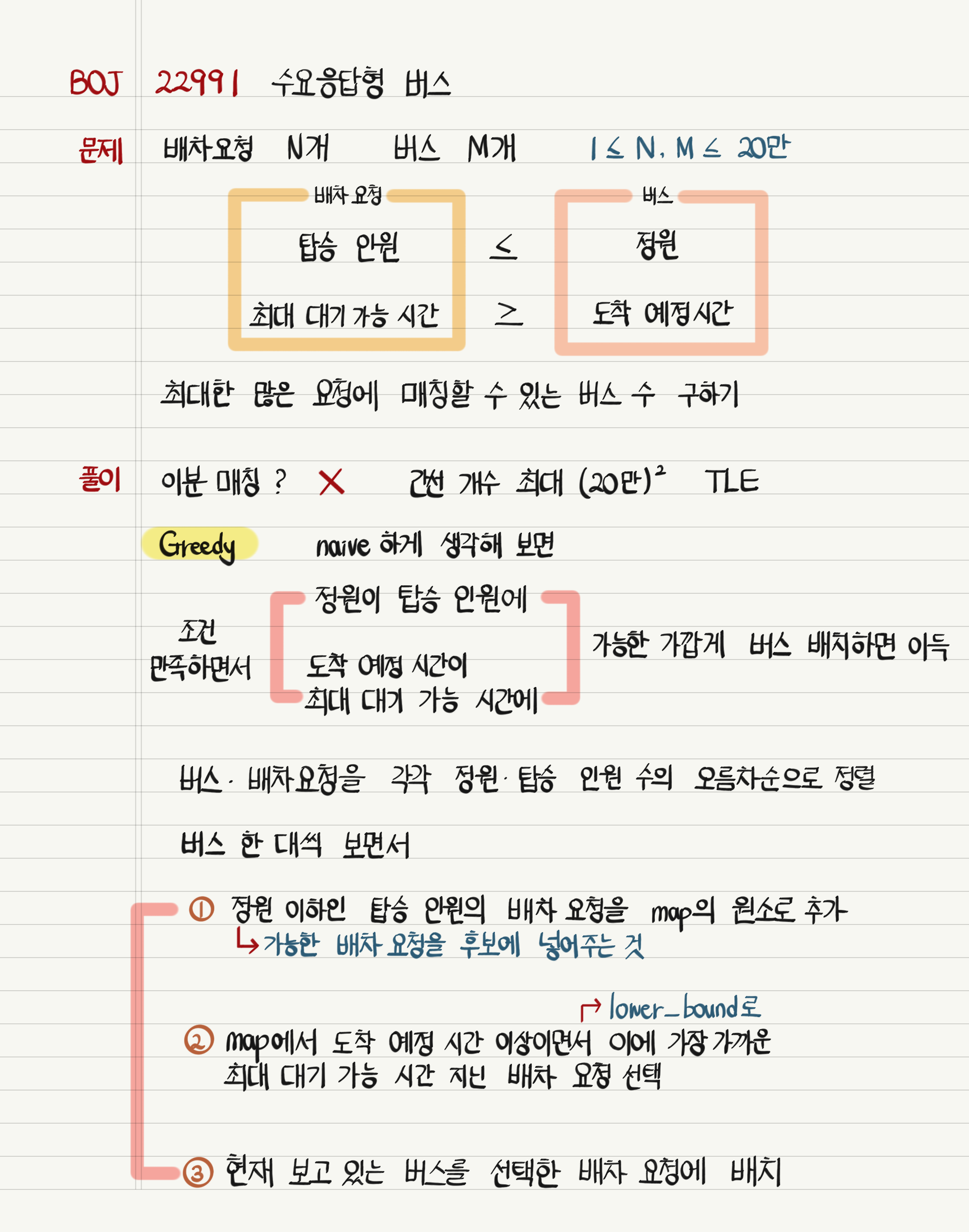 그런데 리스트 L에서 요청 A를 구할 때는 탑승 인원뿐만이 아니라 최대 대기 가능 시간도 고려해줘야 한다. 여기서부터는 문제 해결이 가능한 적합한 자료구조를 찾아야 한다. 리스트 L에 들어올 수 있는 요청의 최대 수가 20만이므로 일일이 원소 하나씩 보며 찾을 수는 없다. 그래서 이진 탐색으로 빠르게 조건을 만족하는 원소를 찾을 수 있는 자료구조를 사용한다. 여기에는 map, set, multiset 등이 있는데, 필자는 map을 사용했다. 배차 요청을 최대 대기 가능 시간의 오름차순으로 정렬했을 때, 버스의 도착 예정 시간 이상이면서 가장 첫 번째로 오는 최대 대기 가능 시간을 지닌 원소를 찾아야 한다. 이는 map의 lower_bound 함수로 구현 가능하다.