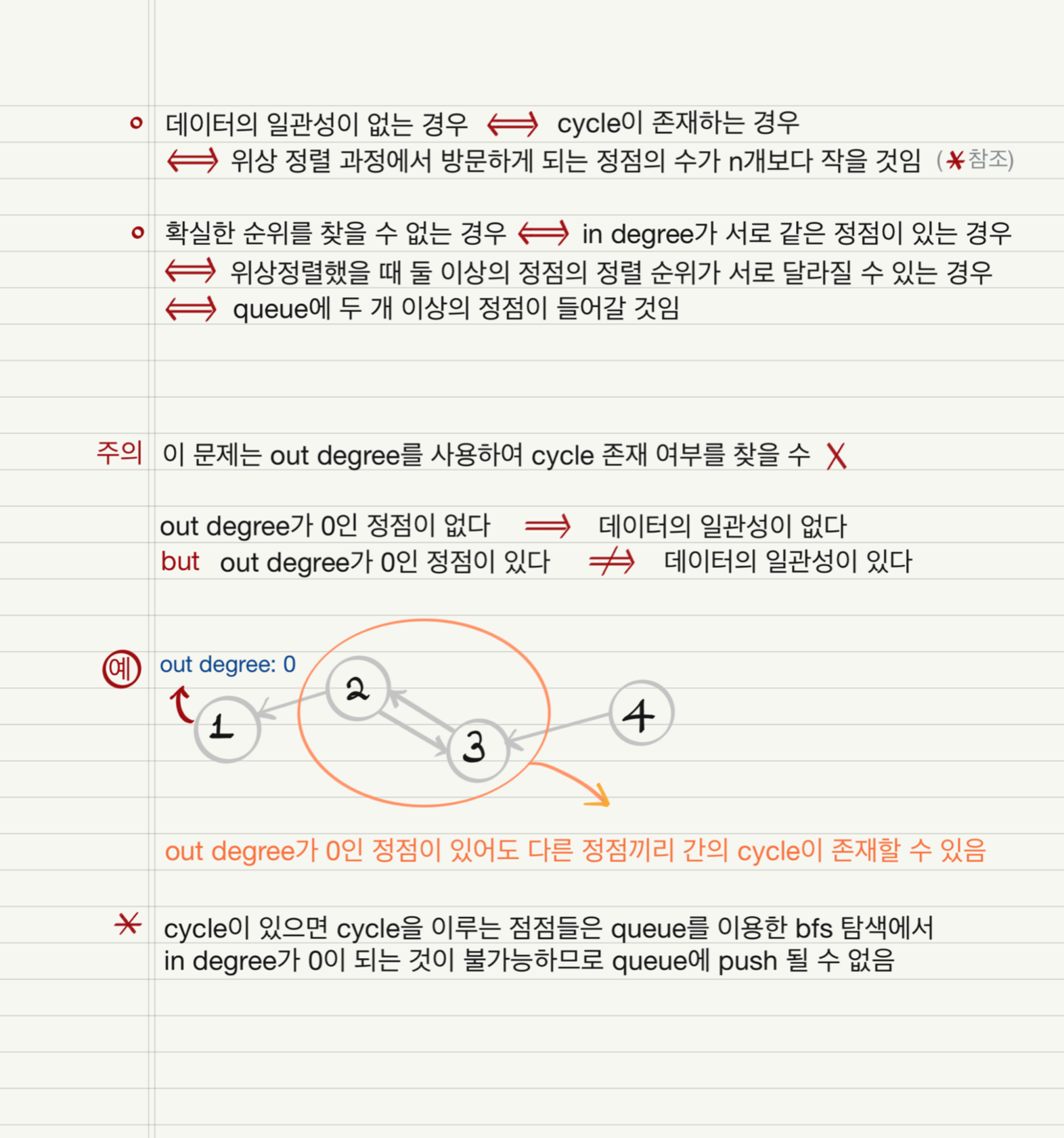 1) 데이터의 일관성이 없는 경우↔ cycle이 존재하는 경우↔ 위상 정렬 과정에서 방문하는 정점의 수가 n개보다 작다