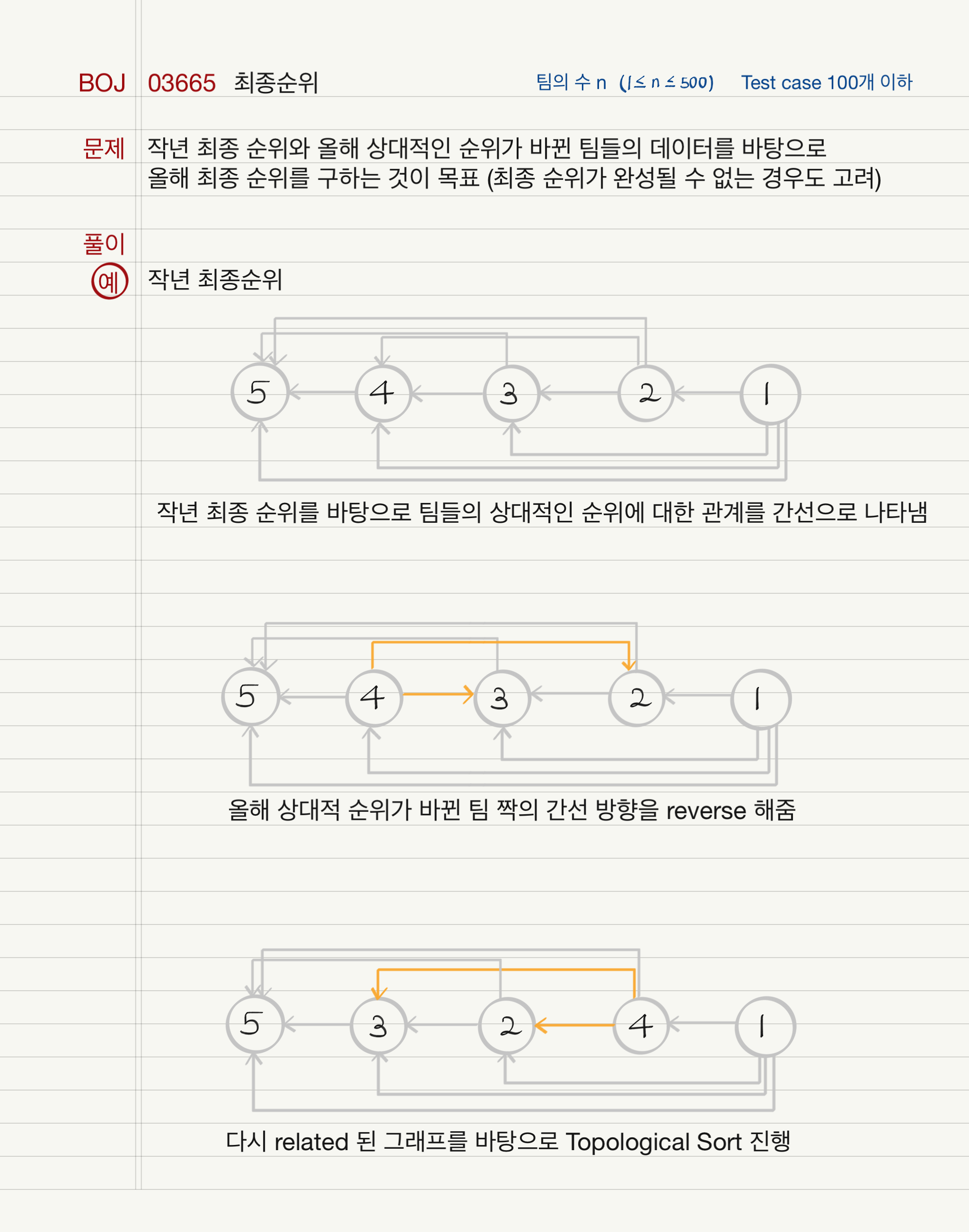최종 순위가 완성될 수 있으면 이는 위상 정렬로 문제를 풀 수 있는 조건을 만족한다. 각 팀은 정점으로 나타낼 수 있고, 순위가 낮은 곳에서 높은 곳으로 정점 간 간선을 이어 줄 수 있으며, 최종 순위 완성이 가능함은 그래프로 나타냈을 때 cycle이 존재하지 않음을 의미하기 때문이다. 따라서 directed acyclic graph로 표현이 가능하므로 완성 조건에 위배되지만 않으면 위상 정렬로 간단히 풀 수 있는 문제이다. 위상 정렬 알고리즘은 DFS 방문 순서를 역전하는 방법과 정점의 indegree와 queue를 이용한 BFS를 사용하는 방법이 있는데, 여기서는 최종 순위가 완성될 수 없는 경우를 고려하여 후자를 택했다. (Directed graph에서 DFS를 통해 cycle을 찾을 수 있지만, DFS로 확실한 순위를 찾을 수 없는 경우는 알아낼 수 없다.)