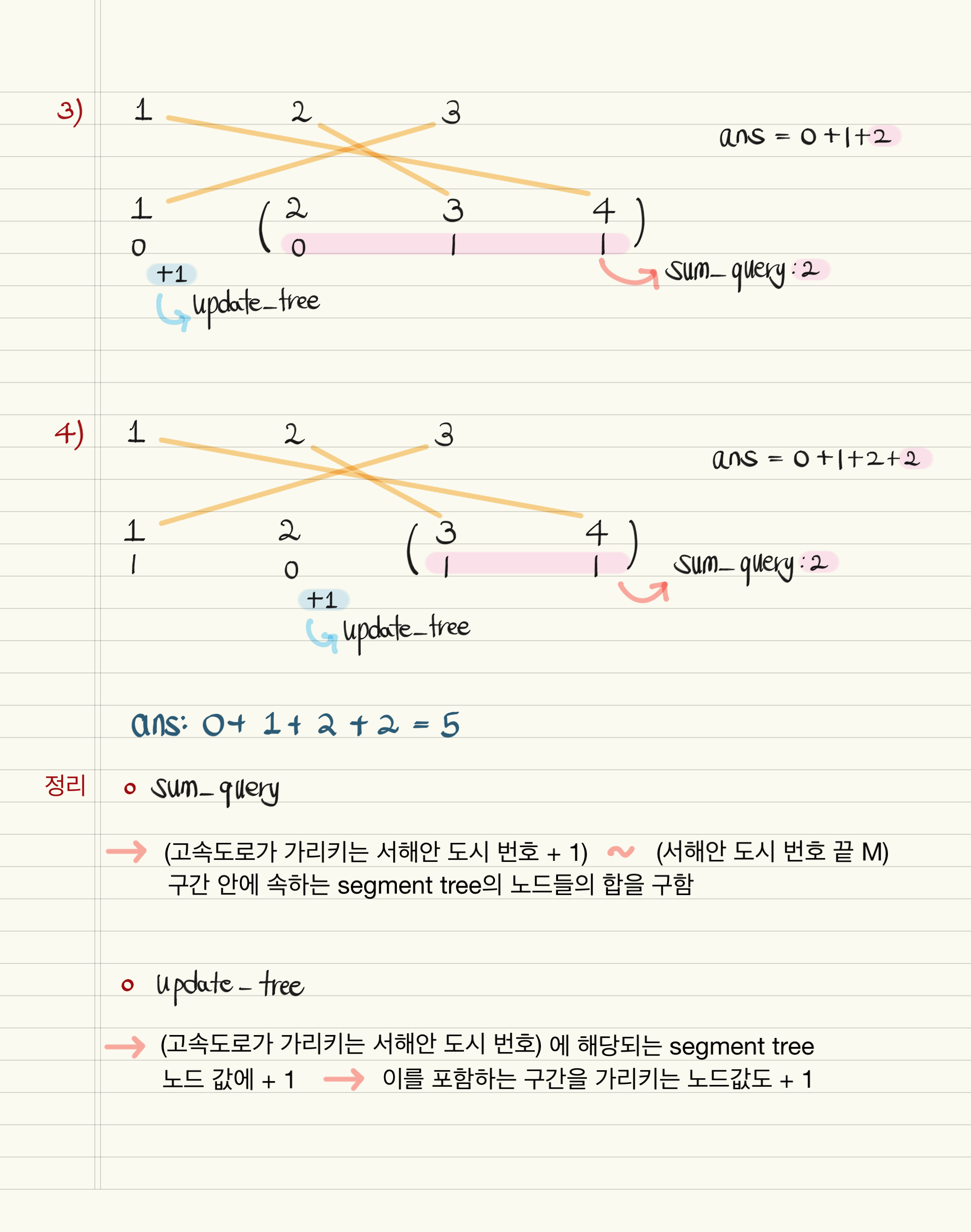 우선 고속도로를 동해안 도시 번호 크기 오름차순으로 정렬하고, 동해안 번호가 같으면 서해안 도시 번호 크기 오름차순으로 정렬한다. 정렬한 고속도로를 앞에서 차례로 보면서 해당 고속도로가 어떠한 서해안 도시 번호와 연결되었는지 확인한다. 이 때 확인한 서해안 도시 번호의 바로 뒷 번호에서 끝 번호까지의 범위가 총 몇 개의 고속도로를 통해 동해안과 연결되었는지 그 개수를 segment tree를 통해 구한다. 이를 수행하는 이유는 동해안 번호가 작은 고속도로부터 차례대로 보기 때문에 현재 서해안 도시 번호보다 뒷 번호에서 연결되는 고속도로가 존재하면 이는 현재 보고 있는 고속도로와 반드시 교점이 생길 수밖에 없기 때문이다. 이를 ans에 더하여 교차되는 구간의 개수를 추가하고, 현재 보고 있는 고속도로 상태를 segment tree에 갱신하기 위해 현재 서해안 도시 번호를 갖고 있는 범위의 segment tree 노드들의 값에 1을 더해준다. 위의 정리 노트에서 예제를 통해 이러한 과정을 설명하는 그림이 있다.