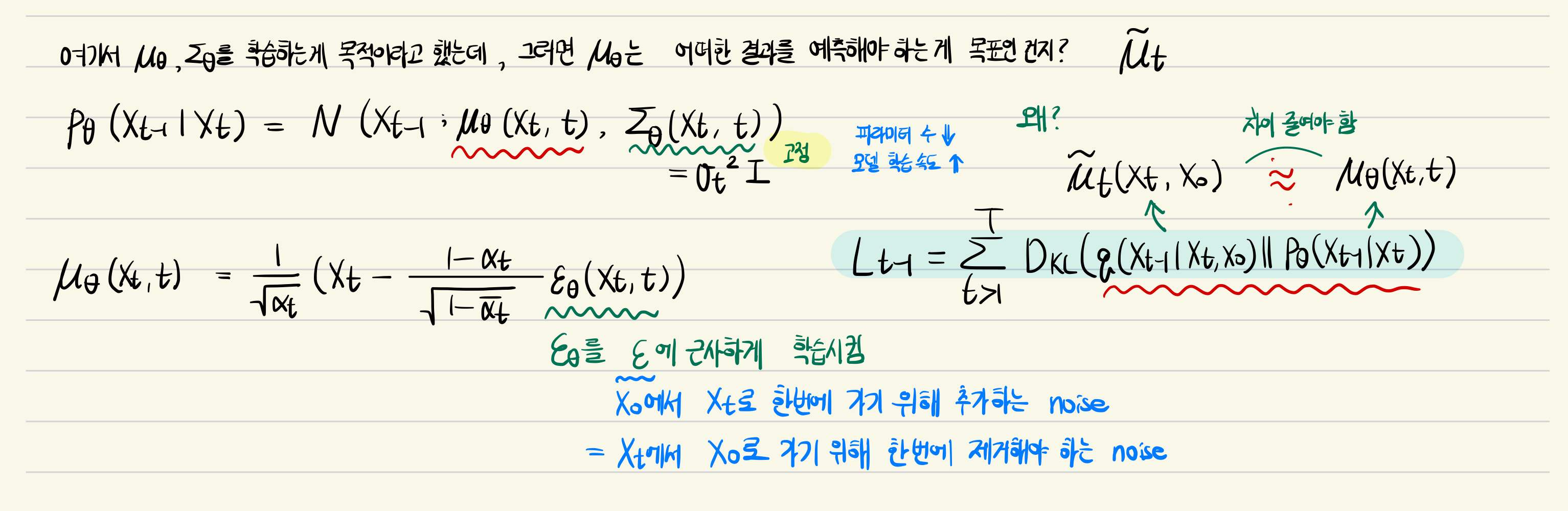 즉, $\mu_{\theta} (x_t, t)$가 $\tilde{\mu}_t$와 가까워지도록 하는 것이 목표이며, $\mu_{\theta} (x_t, t)$도 마찬가지로 reparameterization trick에 의해 $x_t$와 $\epsilon_{\theta}$에 관한 식으로 정리했을 때의 그 $\epsilon_{\theta}(x_t, t)$가 $\epsilon$에 근사하도록 만드는 것이다. 즉, $x_t$에서 $x_0$로 한번에 가기 위해 제거해야 하는 noise가 실제 $x_0$에서 $x_t$로 한번에 가기 위해 추가되어야 하는 noise와 모델이 유사하게 예측하도록 해야 한다.