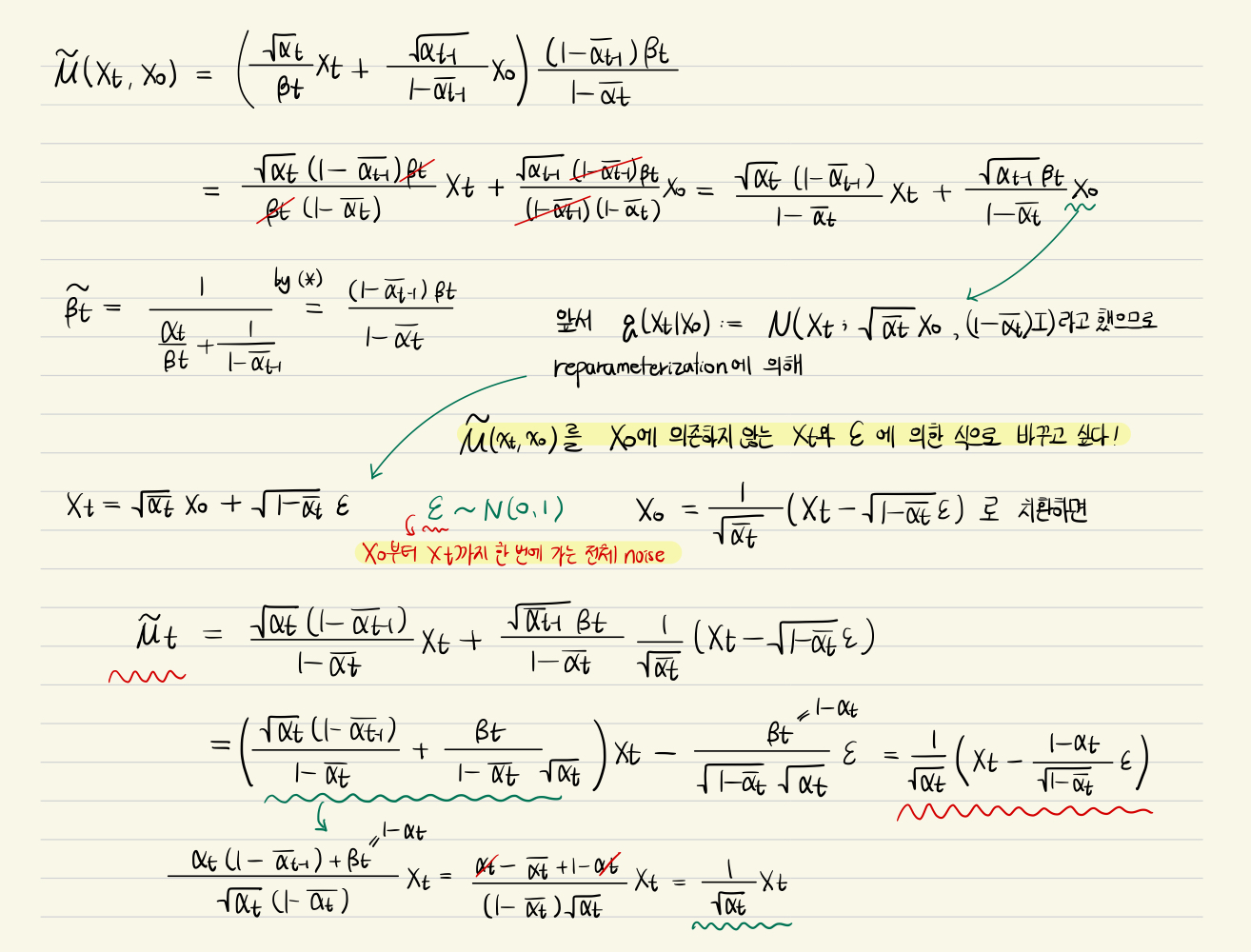 여기도 수식의 향연이라 머리가 좀 아찔해지기는 하지만, 지금 하고자 하는 목적은 $q(x_{t-1} | x_t, x_0)$를 구하는 걸 기억해야 한다. 그런데 $q$와 $p$는 Gaussian distribtuion이라고 앞에서 전제했으므로 $q(x_{t-1} | x_t, x_0)$를 모델링하는 정규분포의 평균과 분산을 구하는 것이다. (실제로 분산은 구하지 않고, 평균만을 예측하는 것으로 한다. 그 이유는 후술할 예정이다.) 정규분포의 확률밀도함수를 사용하여 $q(x_{t-1} | x_t, x_0)$의 평균인 $\tilde{\mu}(x_t, x_0)$을 구하는 식을 정리하는 과정이 위의 노트 필기이다.