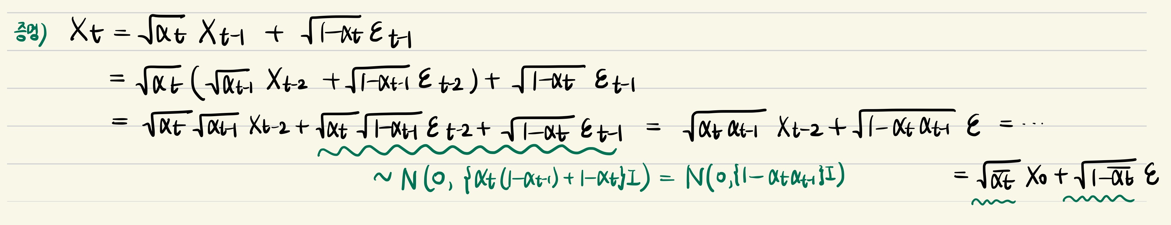 그런데 매번 처음부터 임의의 시간 $t$까지 step을 거쳐서 확률 분포를 모델링한다는 건 번거로운 일이다. 그래서 논문에서는 처음 시간부터 임의의 time $t$까지 바로 확률 분포를 모델링할 수 있도록 했는데, 그 결과는 위의 그림과 같다. 저 $\alpha$가 앞으로 자주 등장하므로 이후 내용을 따라가려면 $\alpha$가 무엇을 의미하는지를 기억해 놓는 것이 좋다. 어떻게 위의 식처럼 도출되었는지는 아래 증명을 참고하면 된다.