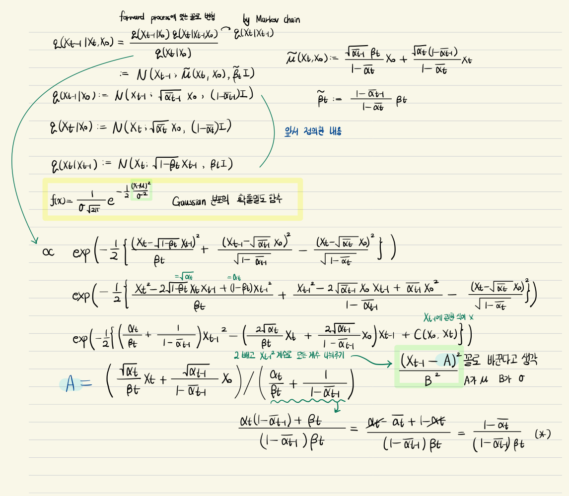 여기도 수식의 향연이라 머리가 좀 아찔해지기는 하지만, 지금 하고자 하는 목적은 $q(x_{t-1} | x_t, x_0)$를 구하는 걸 기억해야 한다. 그런데 $q$와 $p$는 Gaussian distribtuion이라고 앞에서 전제했으므로 $q(x_{t-1} | x_t, x_0)$를 모델링하는 정규분포의 평균과 분산을 구하는 것이다. (실제로 분산은 구하지 않고, 평균만을 예측하는 것으로 한다. 그 이유는 후술할 예정이다.) 정규분포의 확률밀도함수를 사용하여 $q(x_{t-1} | x_t, x_0)$의 평균인 $\tilde{\mu}(x_t, x_0)$을 구하는 식을 정리하는 과정이 위의 노트 필기이다.