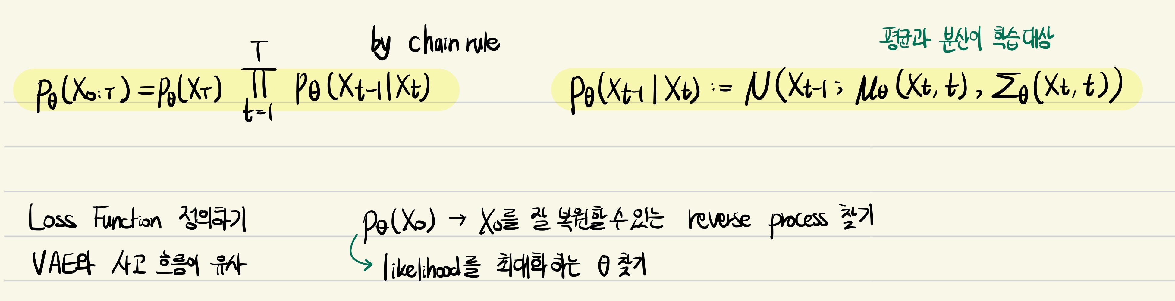 Reverse process는 위와 같이 정리할 수 있는데, 왼쪽 식을 해석하면 denoising 과정을 통해 $x_T$부터 $x_0$까지의 매 time step의 output을 내는 likelihood를 의미하는 것이다. 즉, likelihood를 구하는 것이므로 $\theta$가 붙은 것을 유의한다. 오른쪽 식은 $x_t$가 주어졌을 때 denoising을 적용하여 $x_{t-1}$를 output으로 내게 하는 조건부 likelihood를 의미한다. 여기서 주목할 점은 time $t-1$에서의 Gaussian distribution의 평균과 분산이 $x_t$와 time $t$에 의존한다는 것이다. 그래서 정리를 하면 임의의 time step $t-1$에서의 reverse process는 Gaussian distribution을 따르는데, 그 분포의 평균과 분산이 $x_t$와 $t$에 의존한다. 그러면 우리가 원하고자 하는 바는 이 평균과 분산이 time step $t-1$에서의 forward process의 과정을 참고하여 잘 모델링하는 것이고, 그것이 denoising diffusion probabilistic model의 loss function을 정의하는 데 필요한 기본적인 아이디어이다.