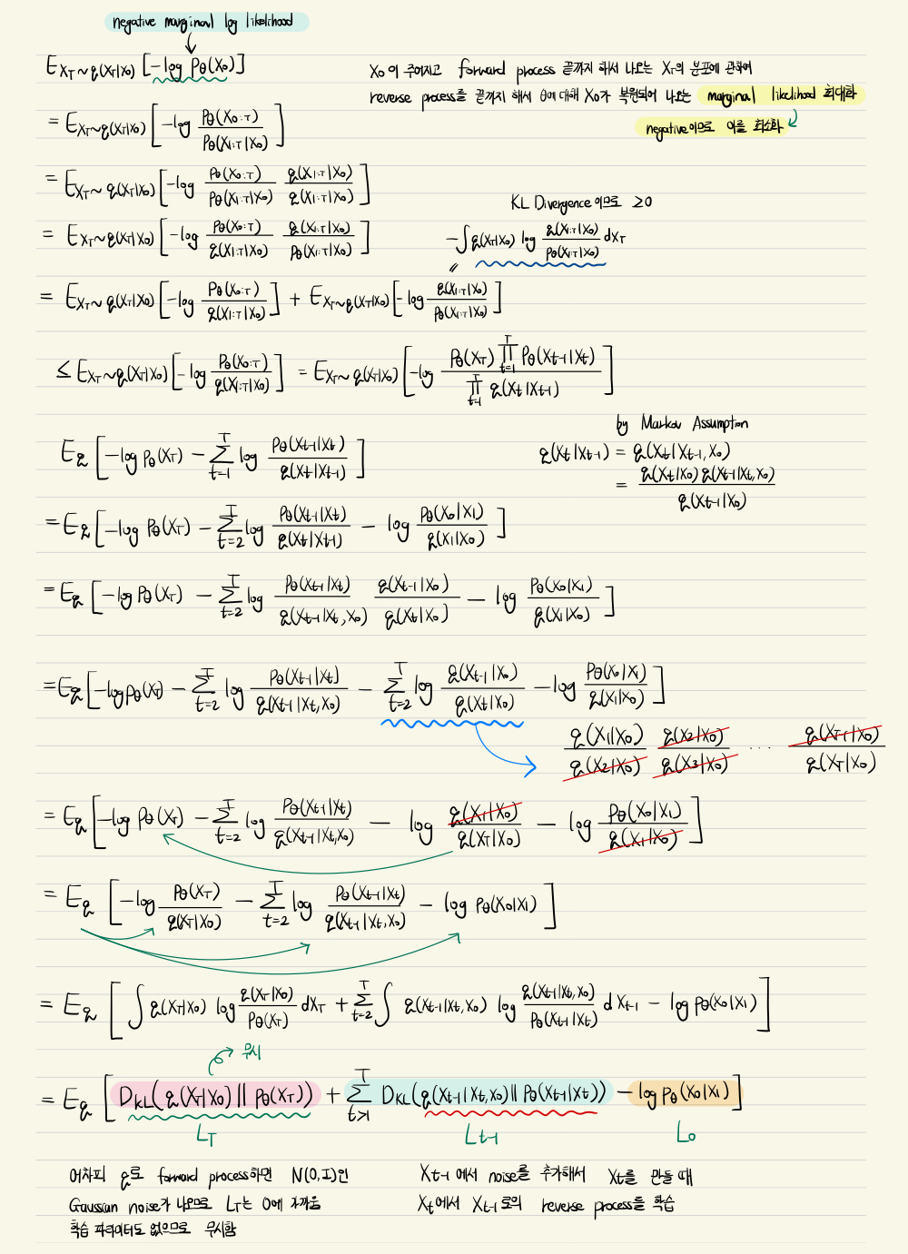 결론은 negative log likelihood인 $-\log p_{\theta} (x_0)$를 최소화하는 것이다. 이 의미는 $x_0$이 주어지고 forward process를 끝까지 해서 나오는 $X_T$의 분포에 관하여 다시 reverse process를 끝까지 해서 $x_0$가 복원되어 나오게 하는 likelihood를 최대화 하기 위함이고, $\log$와 음수를 붙여서 negative log likelihood를 최소화하는 것으로 바꾼 것이다.