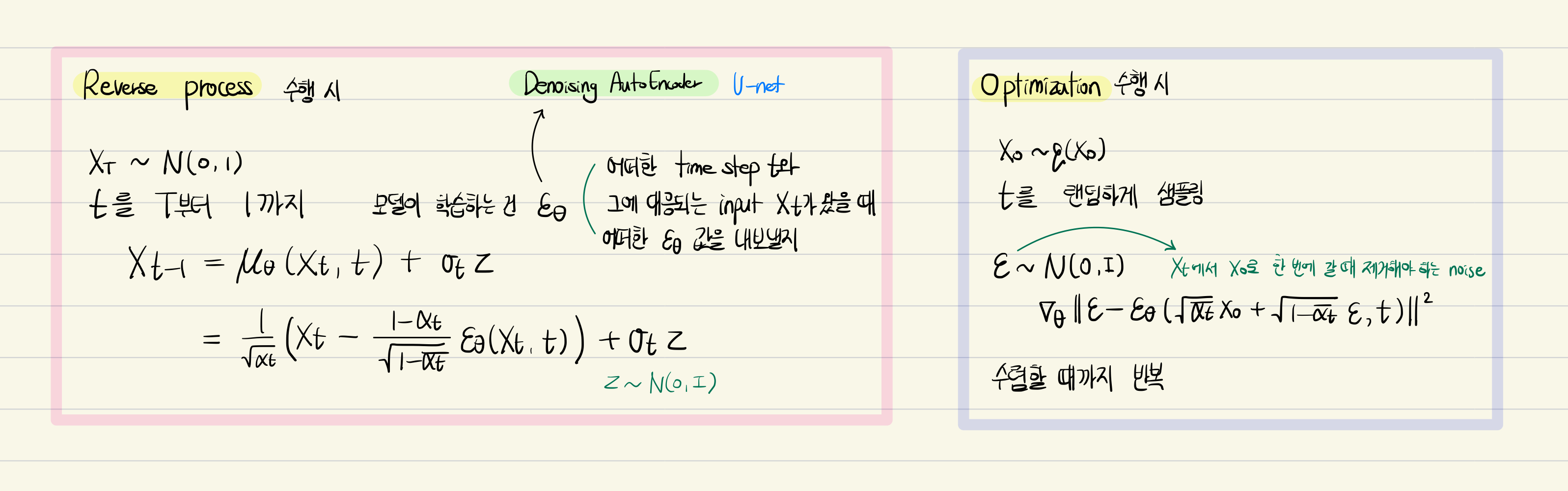 글 작성 시점 기준으로는 diffusion model이 큰 각광을 받고 있다. 이번 글에서는 diffusion model이 무엇이고, 어떠한 이유에서 기존의 생성 모델보다 더 주목을 받고 있는지를 확인해 보고자 한다. 이 모델의 배경이 되는 논문이 바로 DDPM(Denoising Diffusion PRobabilistic Models)인데, 이 글에서는 논문의 내용을 상세히 살펴보기 보다는 핵심적으로 알아두어야 할 내용 위주로 노트 필기와 함께 정리해보고자 한다.
