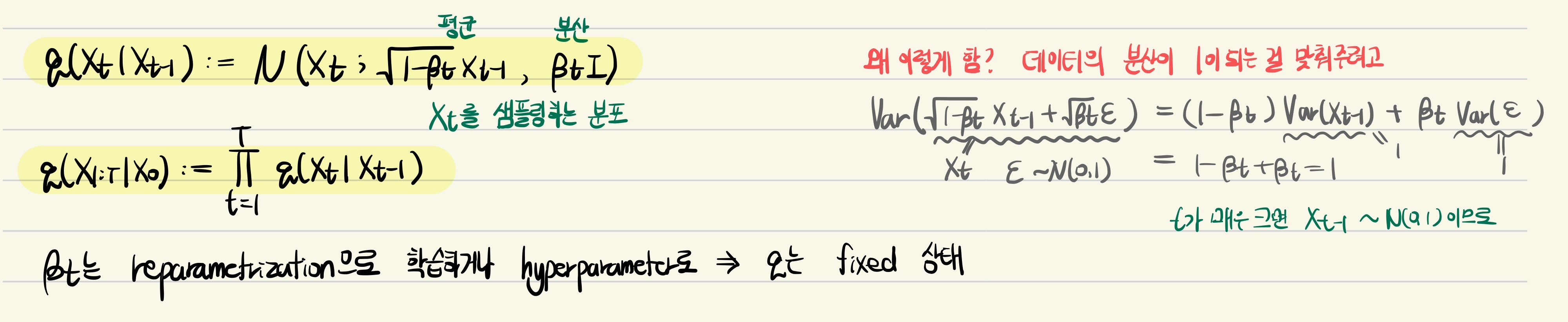 여기서 $\beta_t$는 매 time step 마다 다른 값을 지니도록 사전에 hyperparameter로 설정했다고 논문에서는 언급하고 있다. 즉, forward process $q$는 데이터만 정해지면 fixed 상태임을 유추할 수 있다.