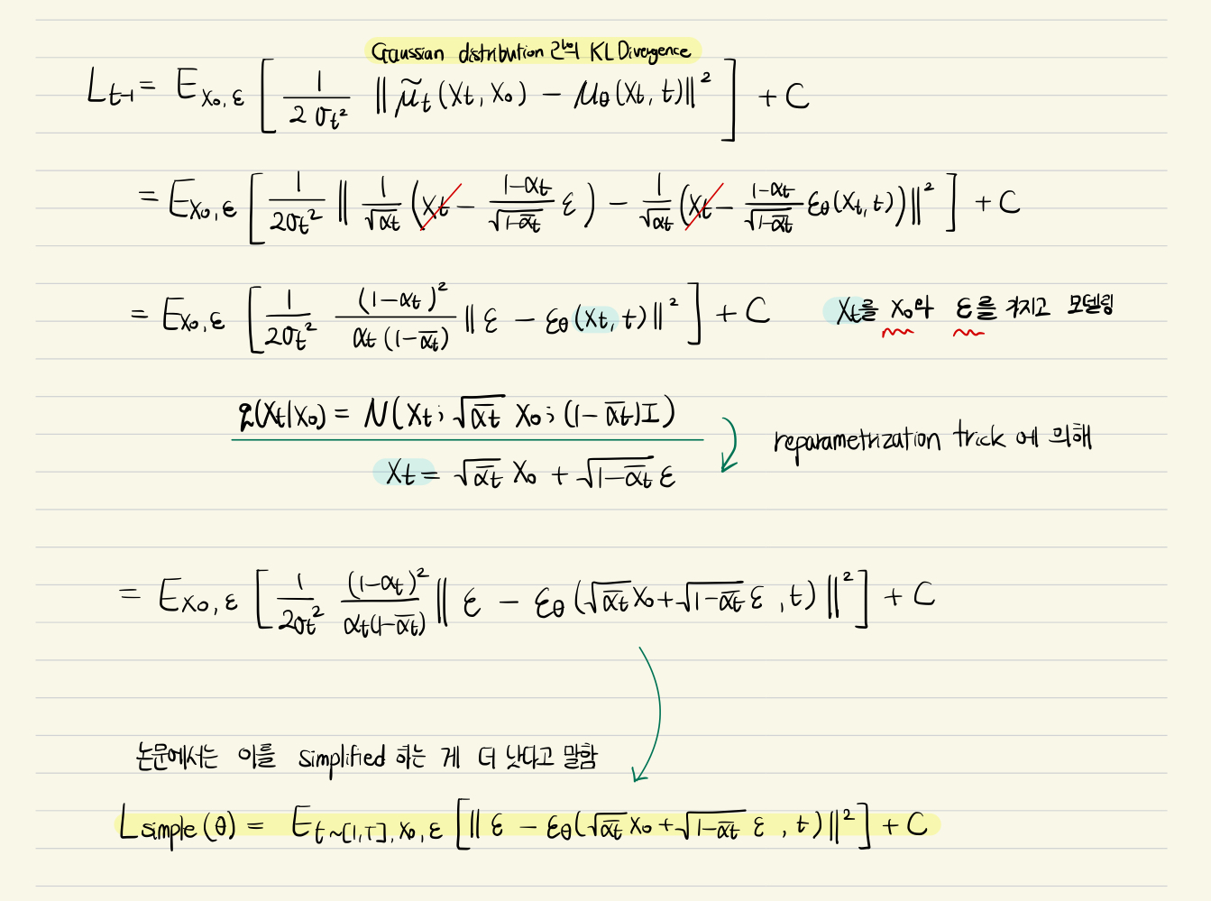 앞서 나온 파라미터들을 바탕으로 $q(x_{t-1} | x_t, x_0)$와 $p_{\theta}(x_{t-1} | x_t)$의 Gaussian distribution 간의 KL divergence를 구하는 과정을 정리한 그림이다. 최종적으로는 뒤의 제곱하는 term만 남겨서 loss function으로 정리하는 게 더 낫다고 논문에서 설명하고 있다.