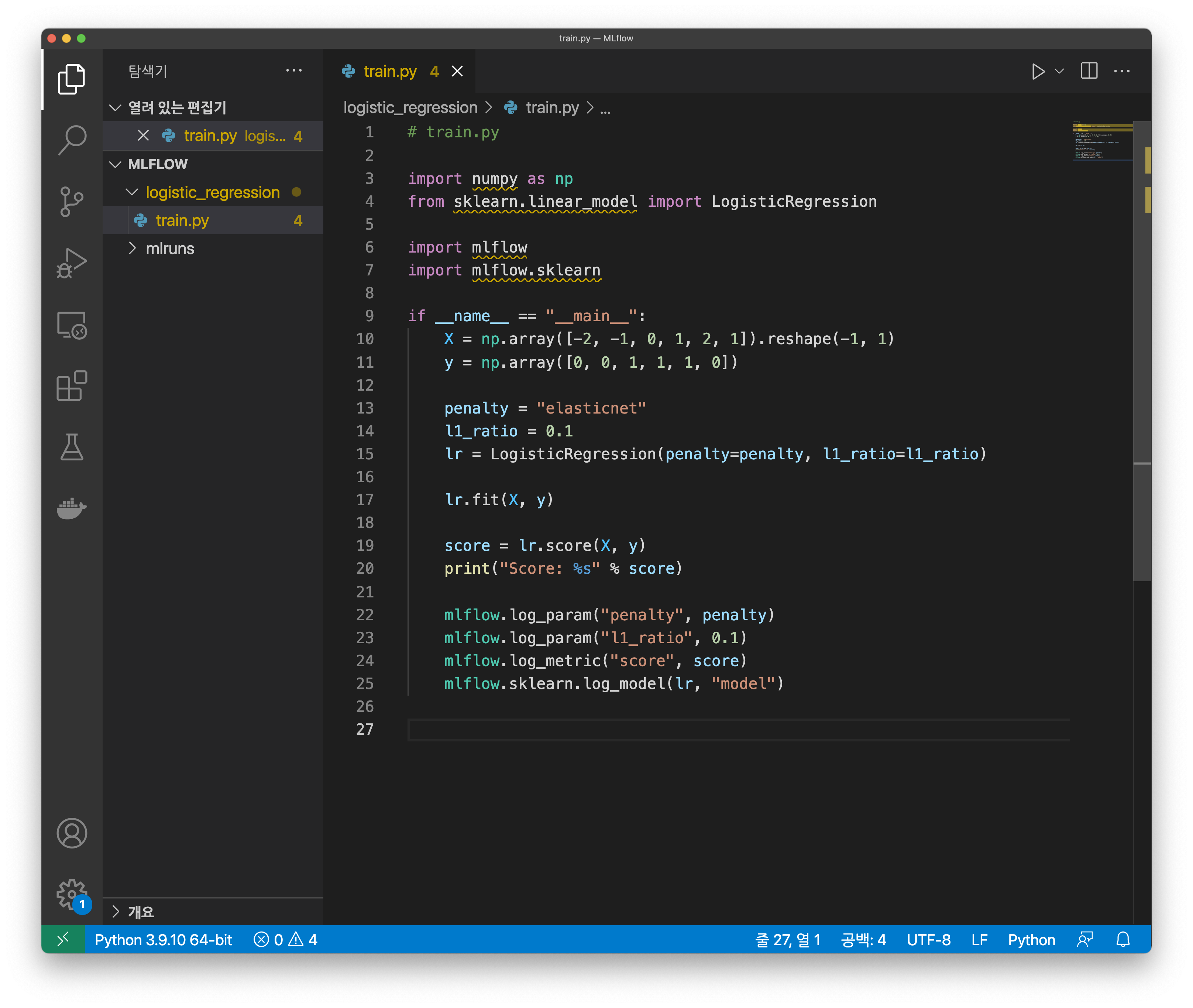 간단히 설명하자면 머신러닝 실험, 배포를 쉽게 관리할 수 있는 오픈소스이며, CLI, GUI(웹 인터페이스 환경)가 지원되는 플랫폼이다. 백문이 불여일견인 것처럼 실습을 통해 어떠한 플랫폼인지를 익히는 것이 이해하는 데 더 빠르다. 머신 러닝 또는 딥 러닝 모델 프로그램을 Python으로 구현하여 실행할 때 아래처럼 mlflow 라이브러리를 import 해 와서 원하는 작업을 수행할 수 있다. 다음 예제는 모델을 학습할 때 학습 내용을 로그로 MLflow에 기록하는 과정이며, with as