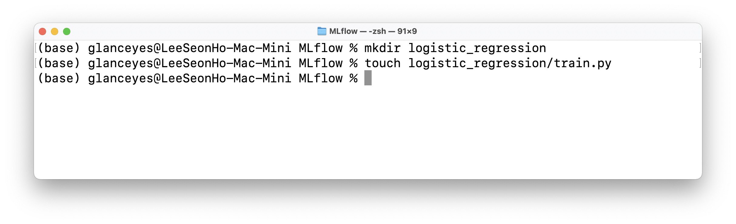 아래처럼 실행한 Python Code가 실행되는 동안 파라미터, metric, model 등 메타 정보를 파일 또는 DB에 저장되는 것을 tree 명령어를 통해 확인할 수 있다. tree 명령어는 현재 디렉토리의 구조가 어떻게 되어있는지를 보여준다.
