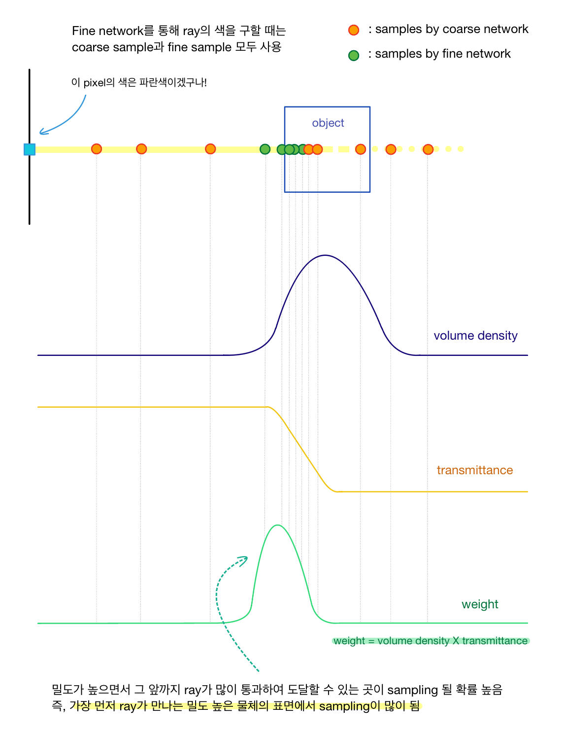 그래서 저자는 coarse와 fine이라는 두 개의 network를 동시에 최적화하는 방법을 택했다. 먼저 coarse network는 앞서 설명한 stratified sampling으로 point를 샘플링하고 volumetric rendering function을 최적화한다. 이 coarse network의 output이 ray의 일차적인 색인 $\hat{C}_c(\mathbf{r})$도 알려주지만, 이 과정에서 각 point별로 구한 transmittance와 volume density를 가지고 ray 위의 점에서 어떠한 부분이 더 ray의 색에 영향을 많이 끼치는지 그 가중치 $w_i$도 구할 수 있으며 이를 바탕으로 다시 샘플링을 수행한다. 여기서 왜 가중치의 개념이 나오는지 궁금하다면 아래 그림을 같이 보면서 이해하면 좋다.