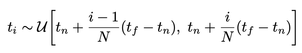 그러나 단순히 구적법으로 적분할 때 쓰이는 값의 개수가 제한되어 있어서 고정된 discrete location의 point set만 뽑을 가능성이 있다. 그래서 논문에서는 stratified sampling 접근법을 사용하여 ray의 범위를 균등한 spaced-bin으로 나누고, 그 bin에서 랜덤하게 point를 sampling 했다.