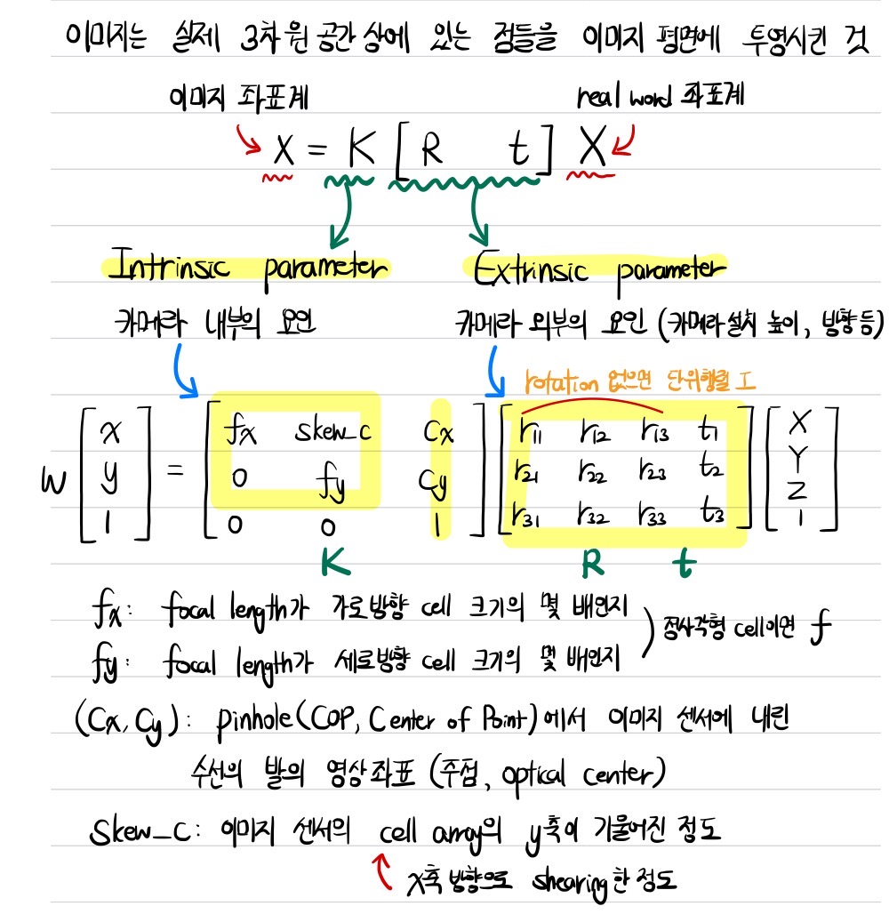 2D 이미지는 실제 3차원 공간상에 있는 점들을 이미지 평면에 투영(projection)시킨 것과 같으며, 투영하는 과정에서 projection matrix를 사용한다. 그러면 이 행렬을 사용하여 이미지 좌표계와 real world 좌표계를 자유자재로 변환할 수 있음을 유추할 수 있다. 이때 projection matrix로 고려되는 게 바로 intrinsic과 extrinsic parameter이다. Intrinsic parameter는 렌즈와 초점(focal point) 사이의 거리인 focal length와 cell의 크기 등 projection에 영향을 미치는 카메라 내부의 요인이고, extrinsic parameter는 카메라가 설치된 위치, 카메라가 바라보는 방향 등 카메라 외부의 요인이다.