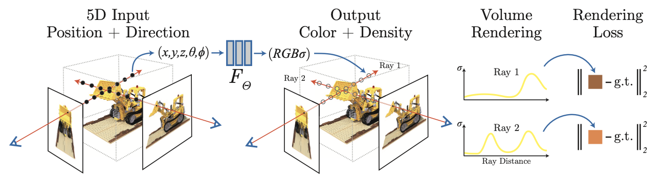이 volumetric rendering을 통해 구한 color와 실제 사진의 color의 loss를 구하고 이 loss를 줄이는 방향으로 최적화하는 것이 이 방법의 핵심이다.