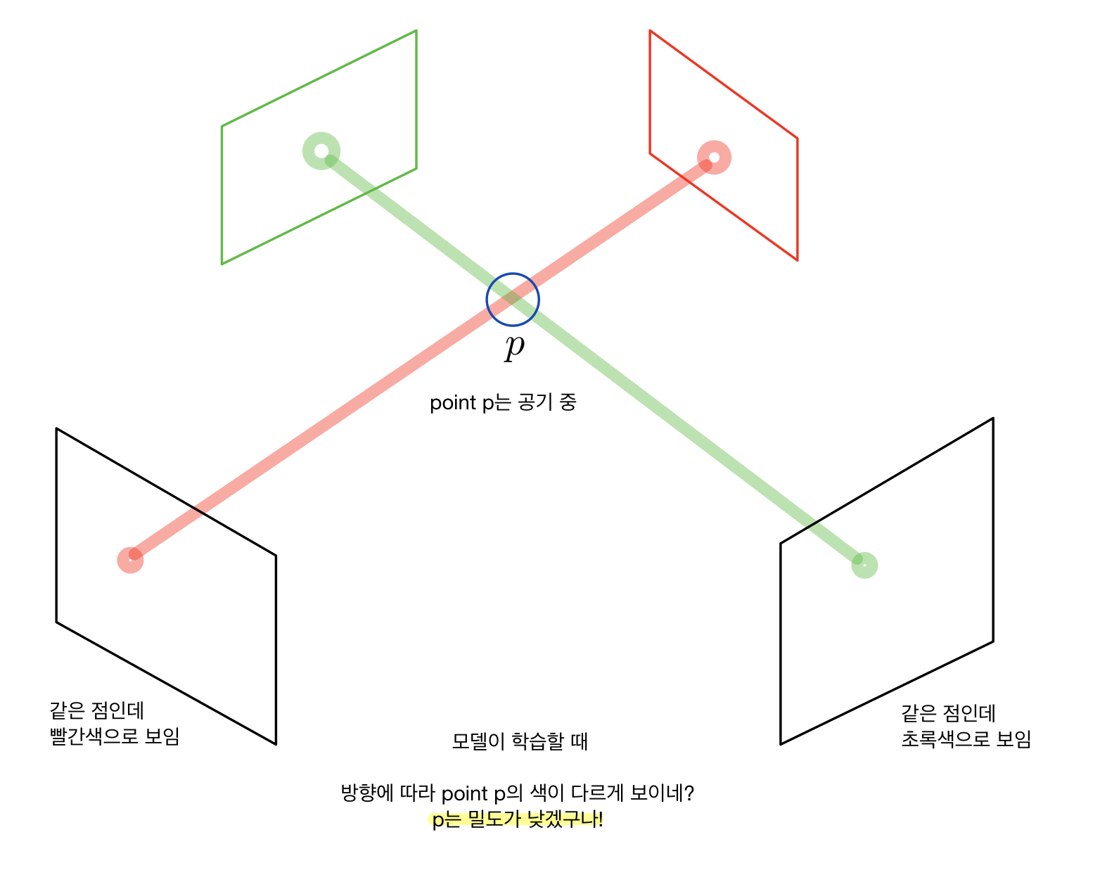 어렵게 서술되어서 그렇지만 그림과 같이 공부하면 쉽게 이해할 수 있다. 예를 들어, 다음과 같이 카메라의 핀홀을 통해 픽셀로 들어오는 ray가 있다고 가정해 보자. 그러면 ray 위의 점들에서 주황색 point들을 A, 초록색 point들을 B라고 하자. A는 공기 중에 있으므로 밀도가 낮고, B는 직육면체인 object에 있으므로 밀도가 높다. 그러면 A와 B 중 픽셀의 색을 결정하는 데 더 많은 영향을 미치는 것은 무엇일까? 바로 B이다. 밀도가 낮으면 그만큼 투명도가 높고, 반대로 밀도가 높으면 투명도가 낮아서 ray의 색에 영향을 덜 미치게 된다.