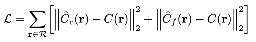 최종적으로 NeRF는 batch 내에 속하는 ray에 관해 coarse network로 예측한 렌더링 색과 ground truth 간의 L2 norm, fine network로 예측한 렌더링 색과 ground truth 간의 L2 norm의 합을 loss로 정의하고, 이를 최소화하는 방향으로 학습한다.