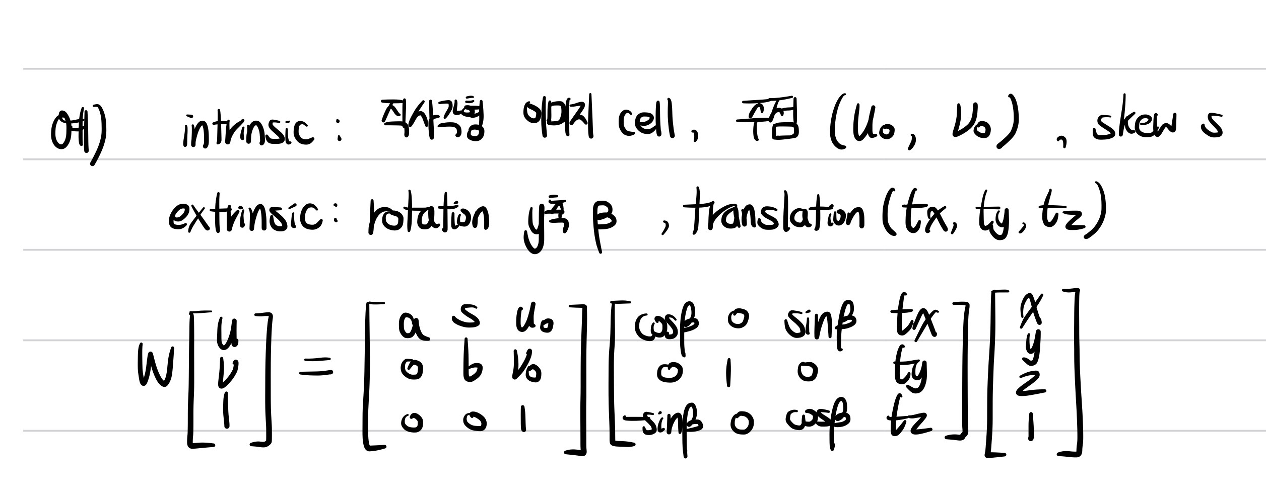 만약 카메라 설치에 관해 rotation과 translation이 바뀌어서 extrinsic parameter에 변화가 생기면 projection은 위의 사진처럼 식을 작성할 수 있다.